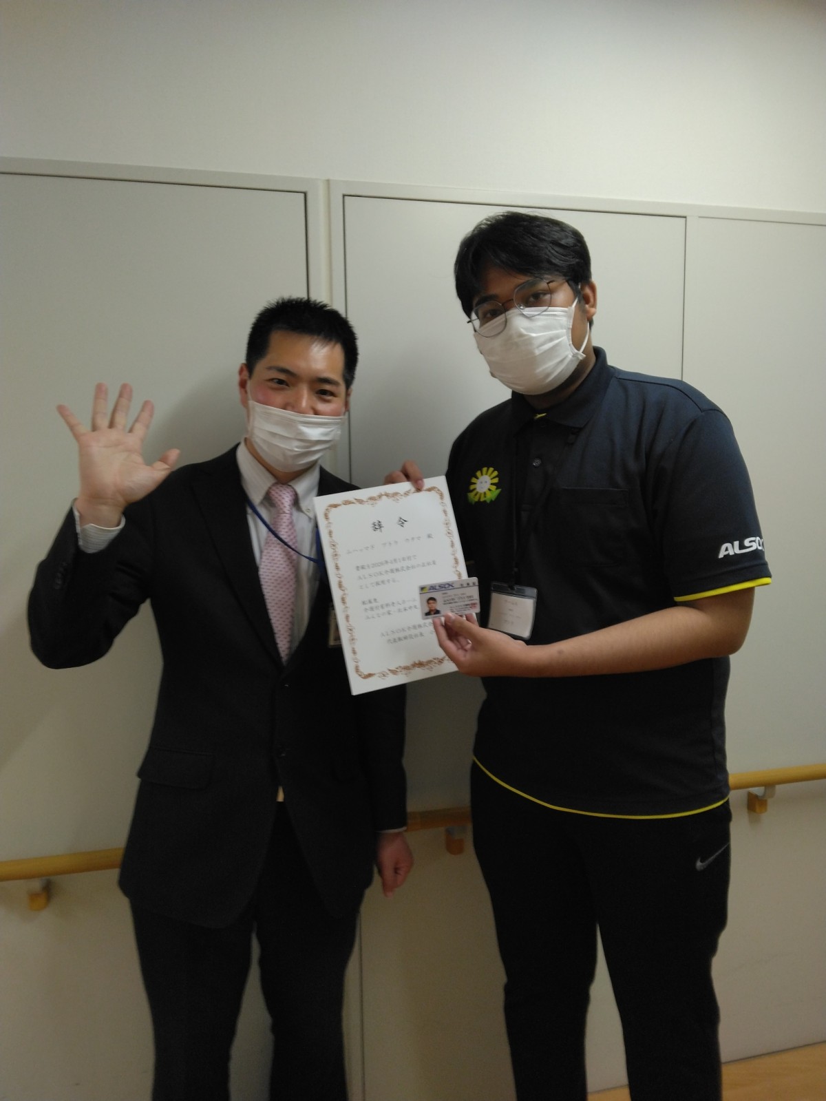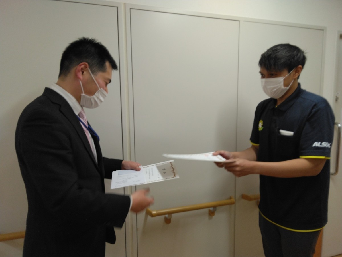 先日、入社前研修を終えて配属された、インドネシアから来た外国人技能実習生ですが、職員のみんなで、ささやかに辞令交付式を行いました。新しい職場でのスタートになりますので、職員みんなで暖かく迎たいと思い企画しました。まだまだ年齢も若い中で、実家を離れて遠く日本に来て一生懸命に仕事をする彼らを職員全員で支えたいと思います。「まだまだ分からない事が多いですが、しっかり業務を覚え、入居している皆様が安心して生活し、また笑顔を守れるよう頑張りたい」と意気込む2名です。見かけた際には是非暖かいエールを送っていただけると励みになります。