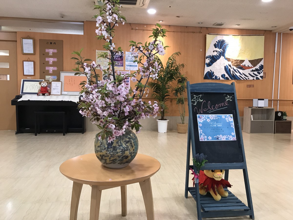 桜の枝を手に持って、目で楽しんで頂いた後に、エントランスホールに飾りました♪