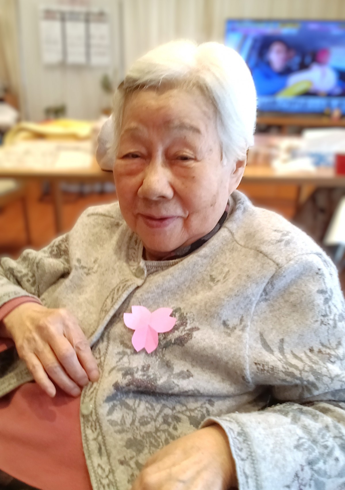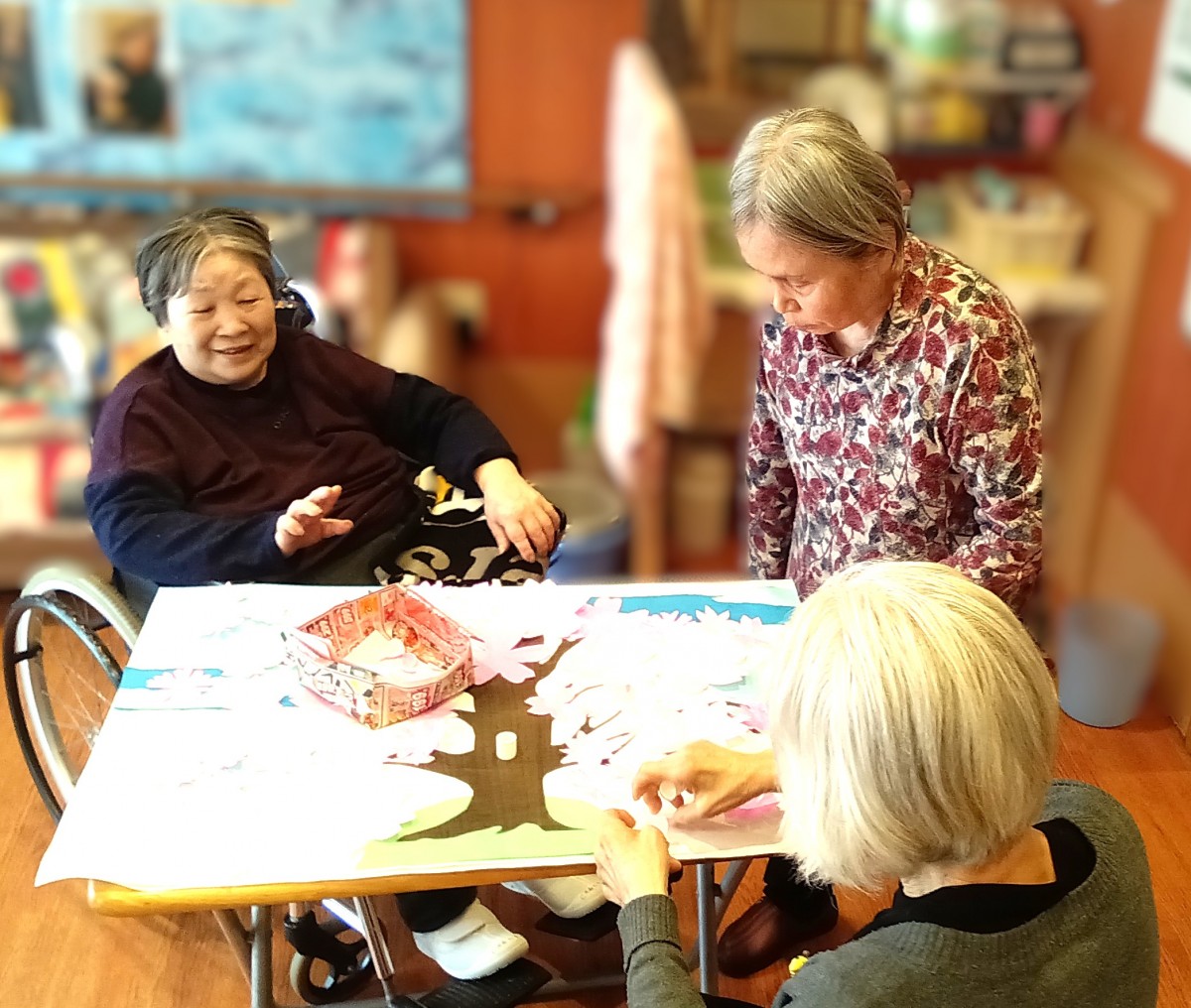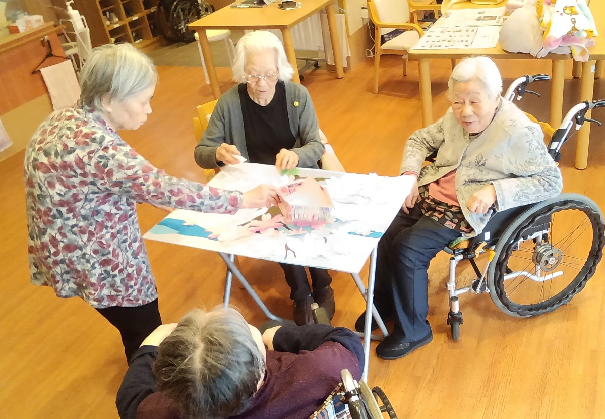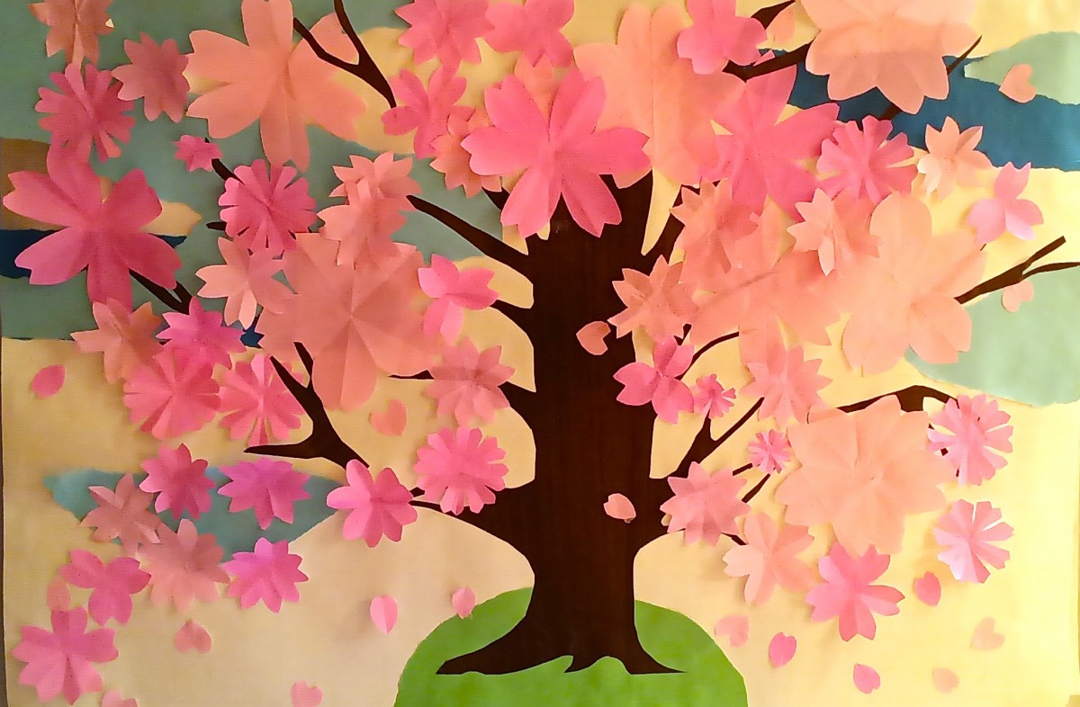 折り紙で作った桜の花を、一枚一枚丁寧に貼り付けていきます