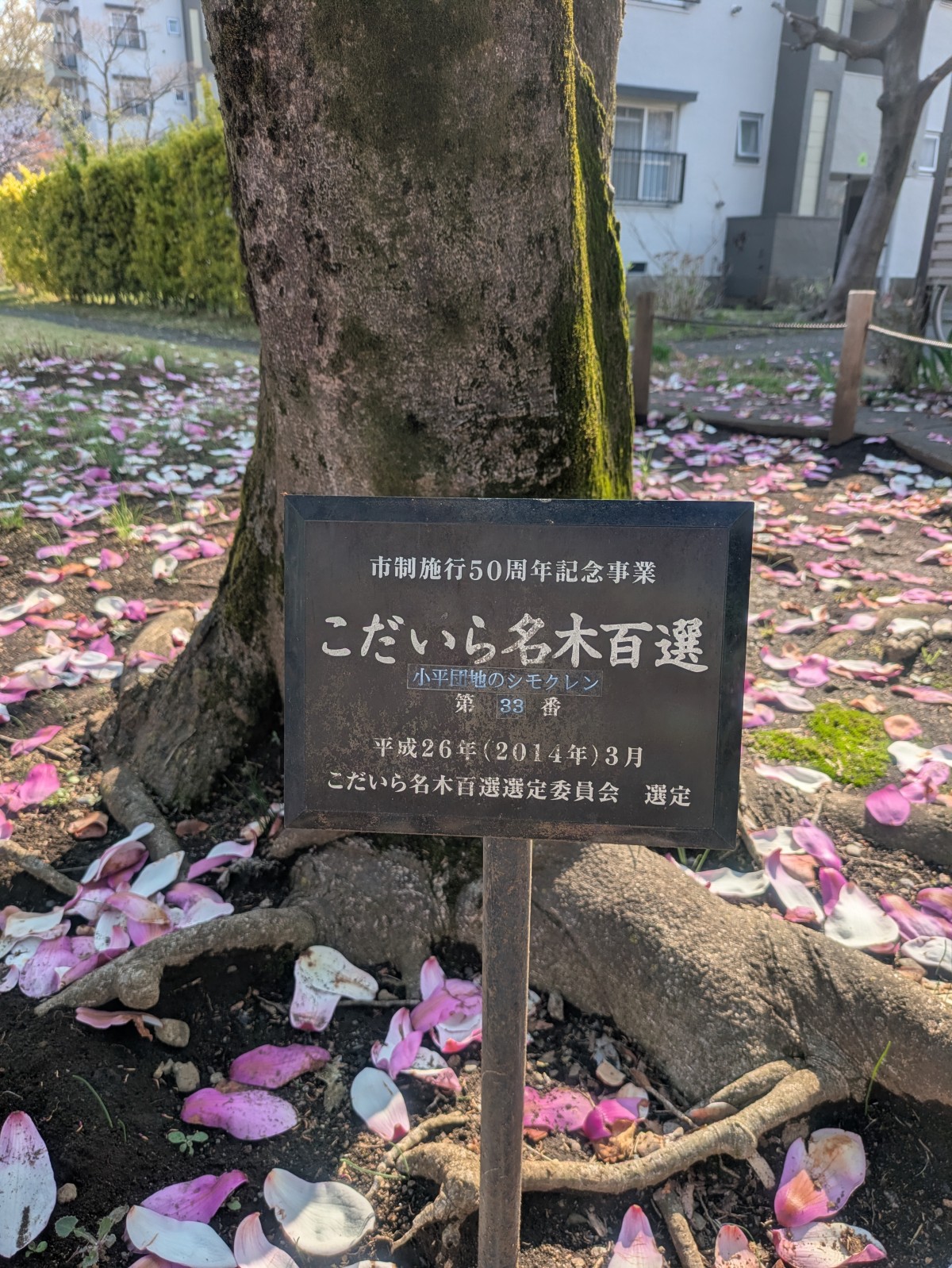 こちらのモクレン、【こだいら名木百選】に選ばれた木のようです。
