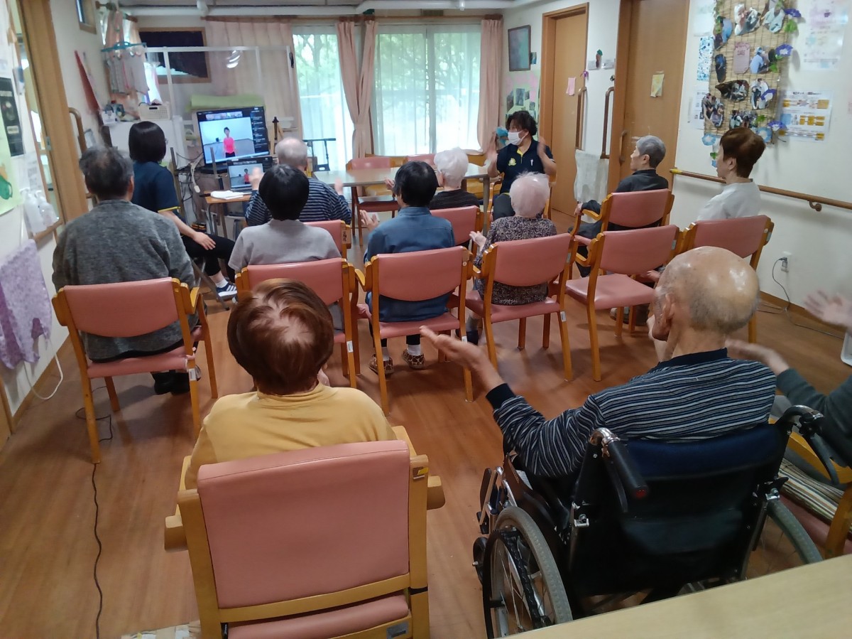 参加された皆様は画面の向こうの先生、左右前に座ったケアスタッフの動きを見て、大きく全身を動かされました。
