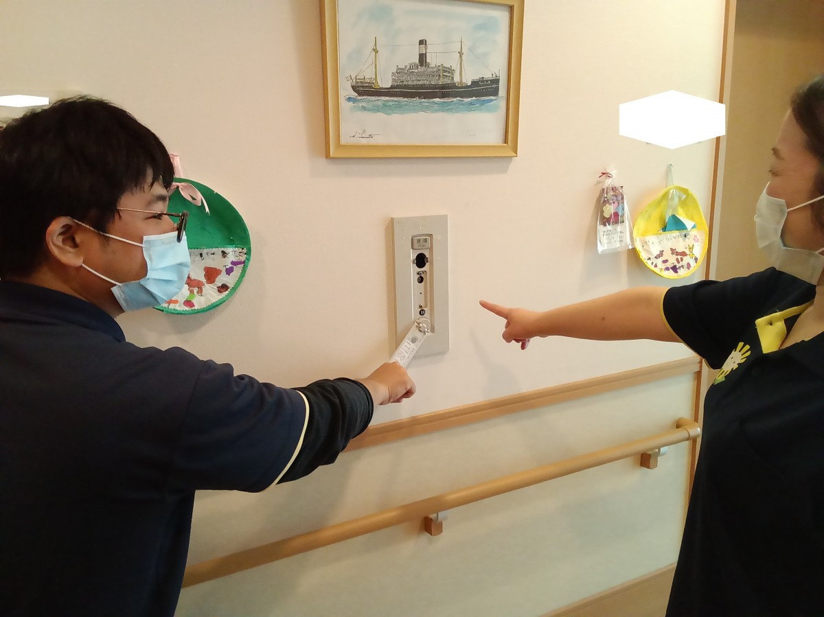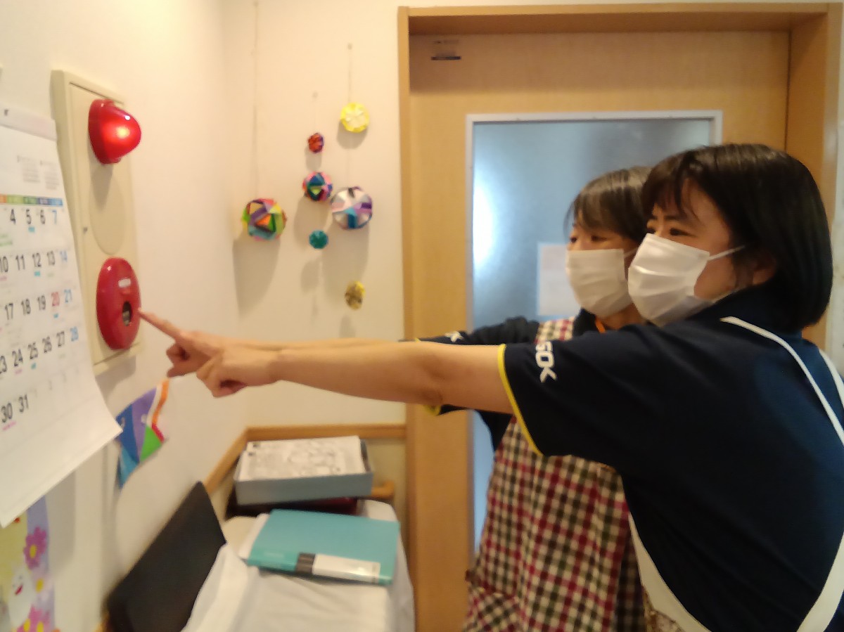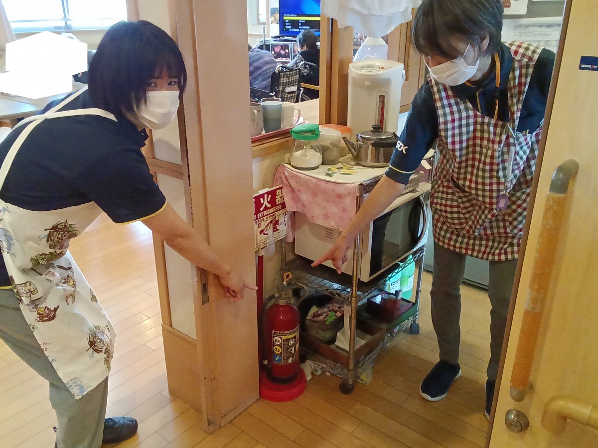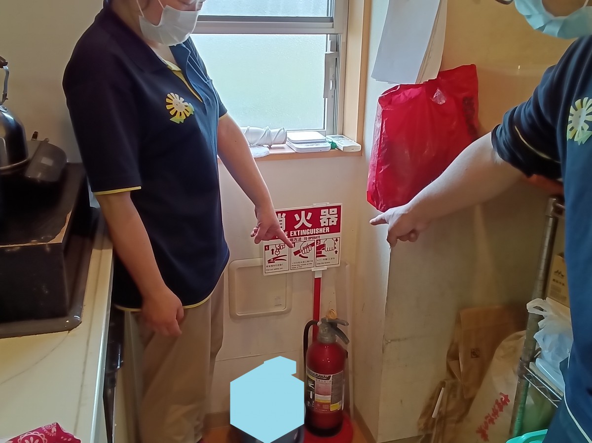 新人社員に消火器の位置や防災管理システムの確認。