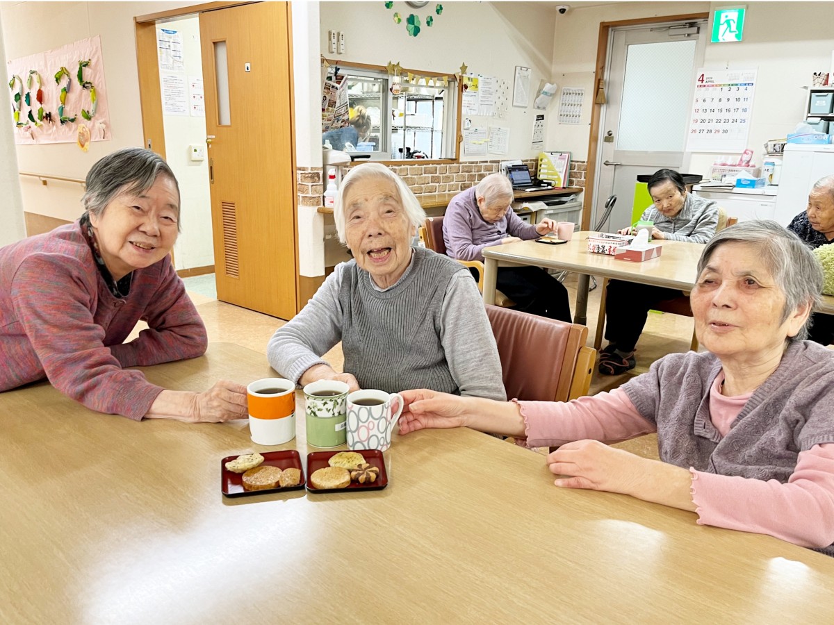 体操の後は、お楽しみのおやつタイム♪「おつかれさま~」と紅茶で乾杯し、いつものおやつより一層美味しく感じられたようです。