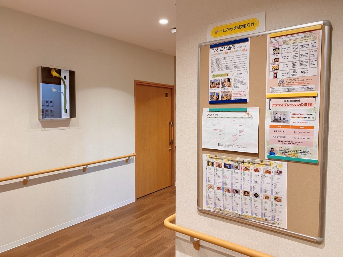 掲示板には、毎月のカレンダーやスマ★サポ(スマイルライフサポート)のご案内、そして日々のお食事を楽しみにしていただける献立表などを掲示しています。