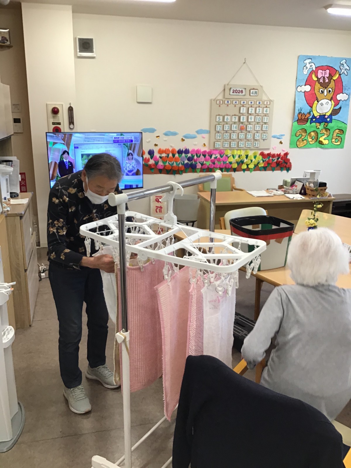職員が洗濯したものを干していただいたり、乾いたものは畳んでいただいたりして頂いています。