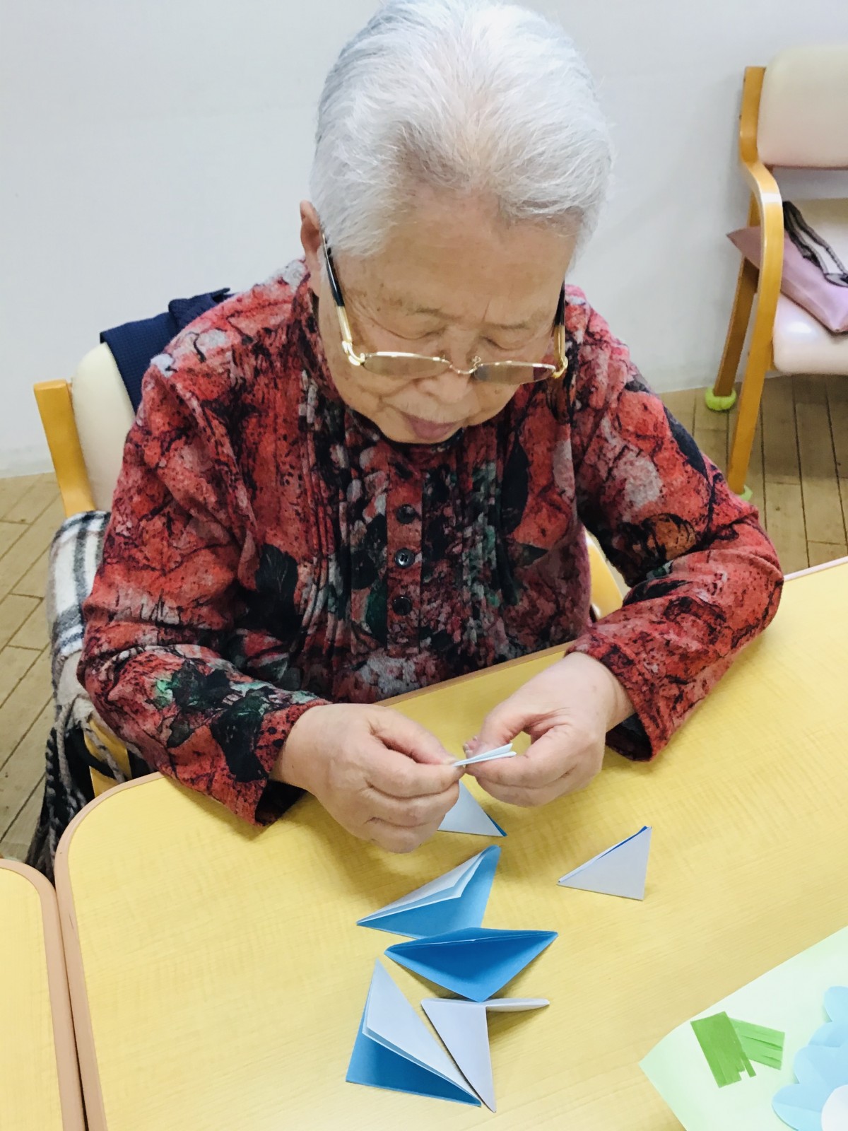 選んだ色紙を三角形に折っていきましょう(*^-^*)