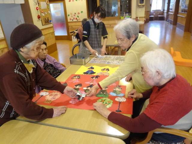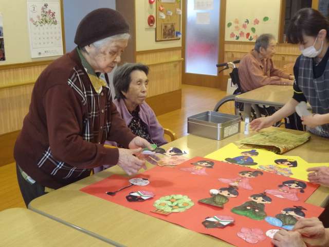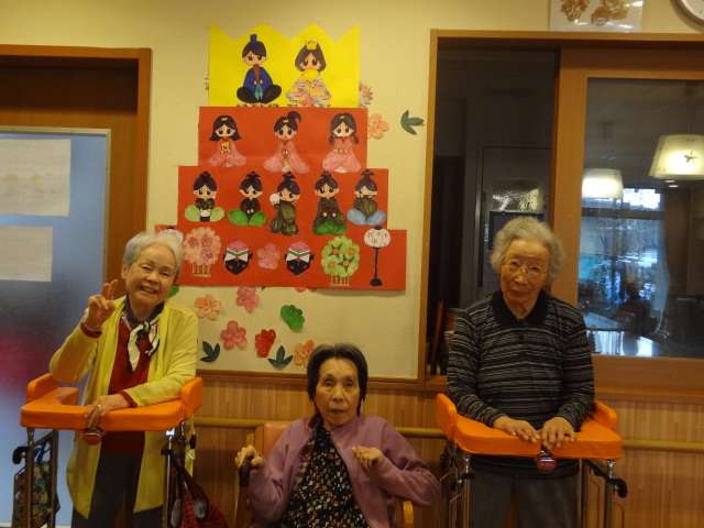 グループホームみんなの家・横浜上瀬谷の壁飾りは雛祭りの貼り絵で華やかです!!