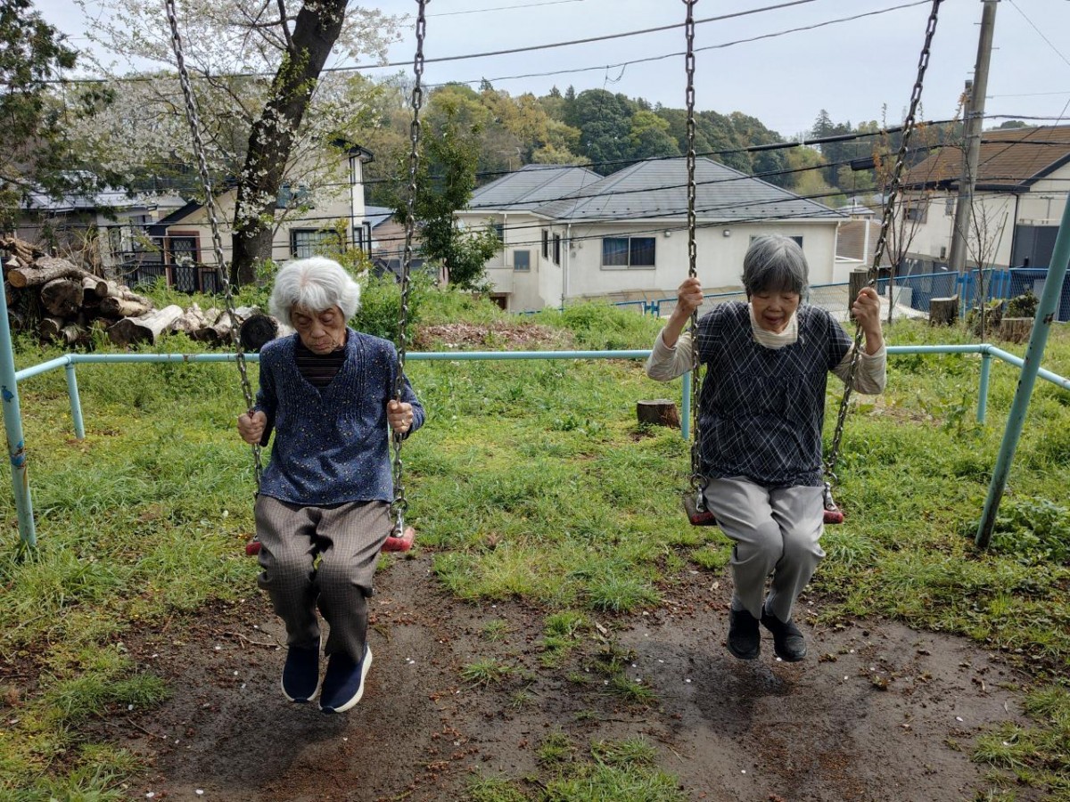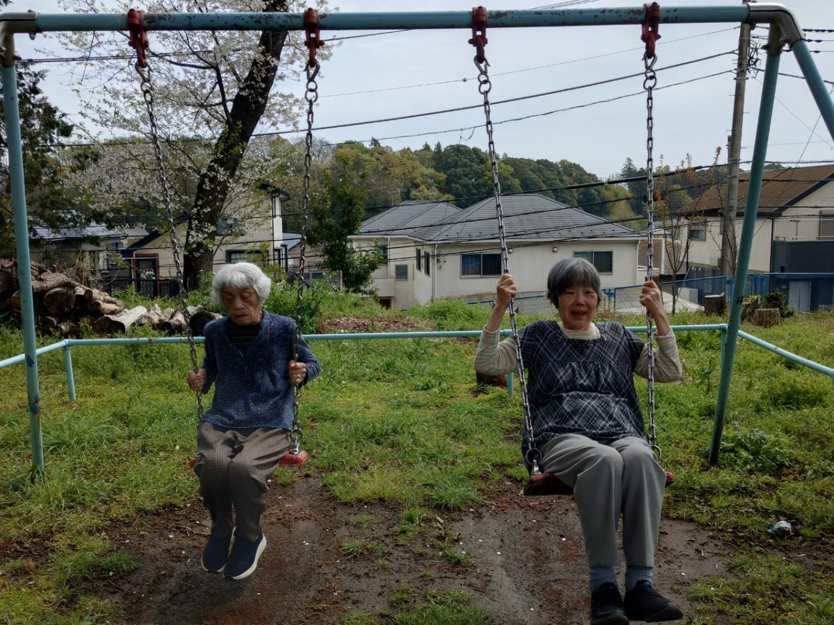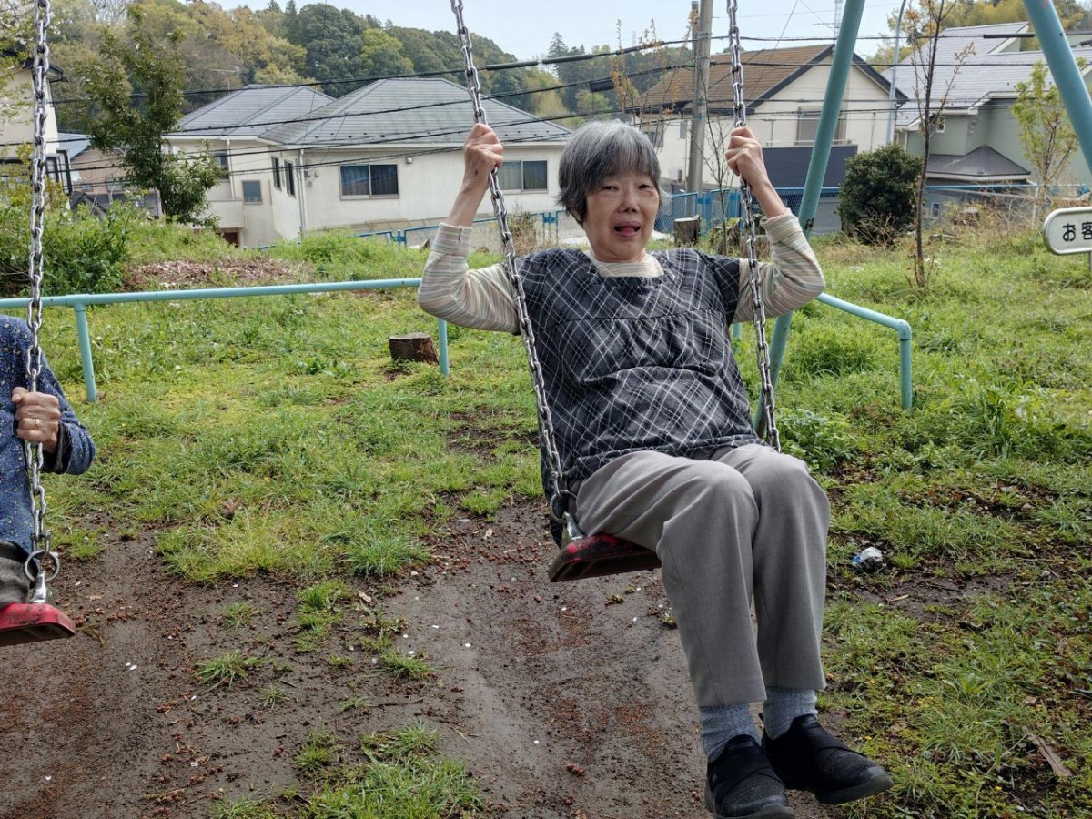 先日のお花見の際、1人の利用者様が「あそこのブランコ乗ってみようかなぁ」と一言。隣に座っていた利用者様を誘ってブランコの方へ・・・