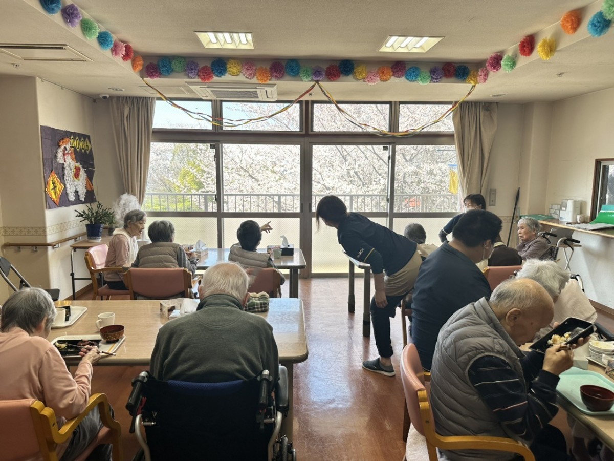 桜の花も満開になり、毎年恒例のお花見をしながら美味しいお弁当を召し上がっていただきました(*^^*)