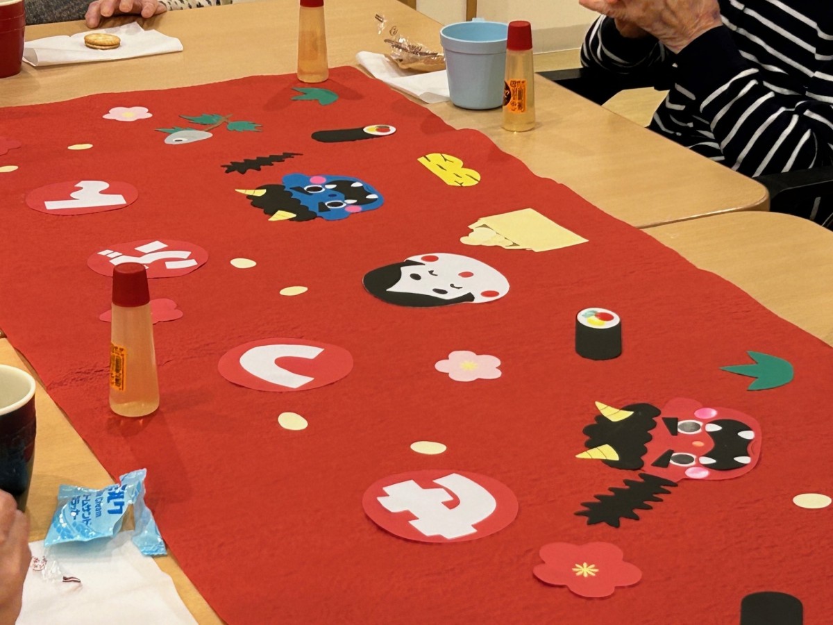 この節分の行事でも、壁絵や小物作りを取り入れ、可愛らしい鬼や福の神、季節の花々を皆さまと一緒に制作しました。