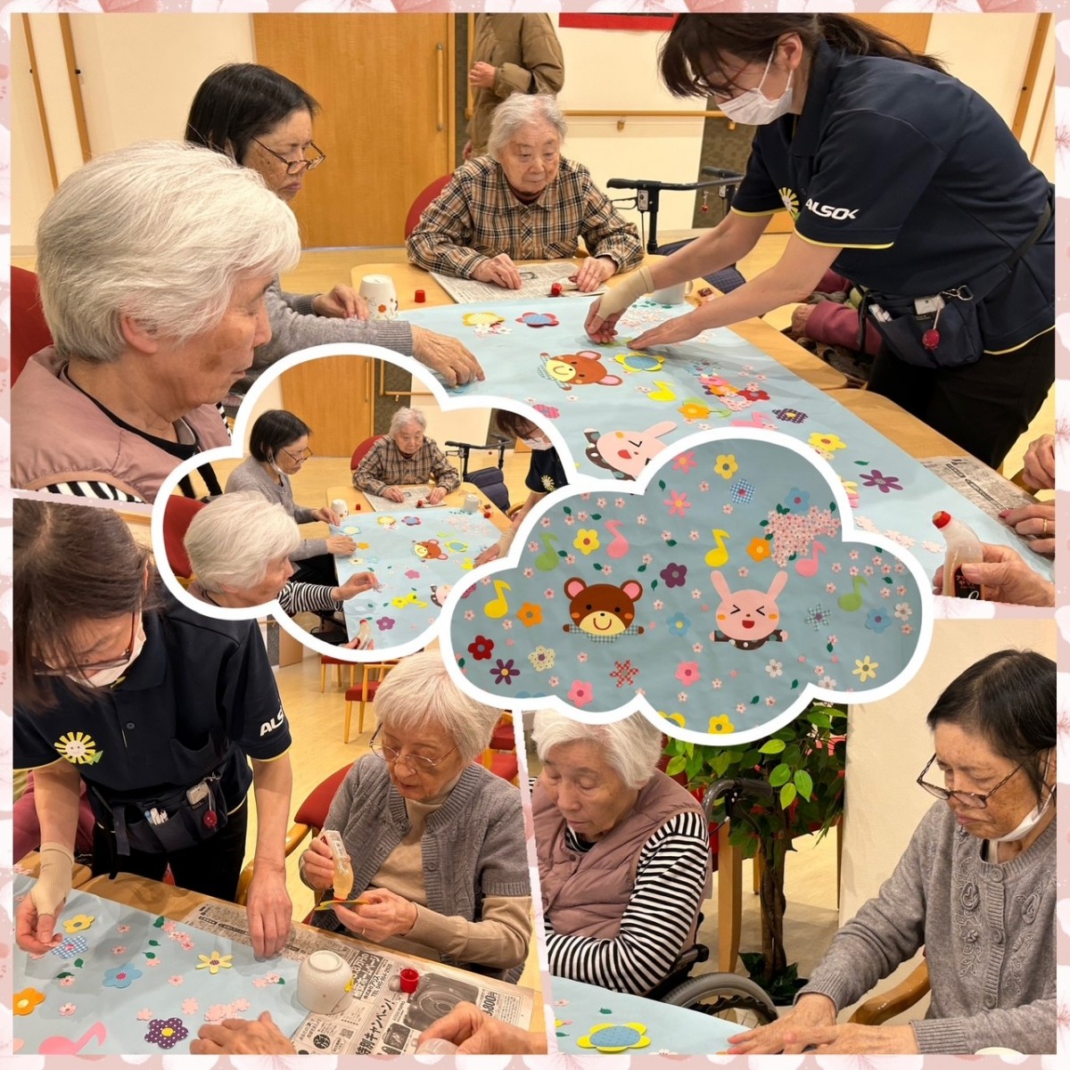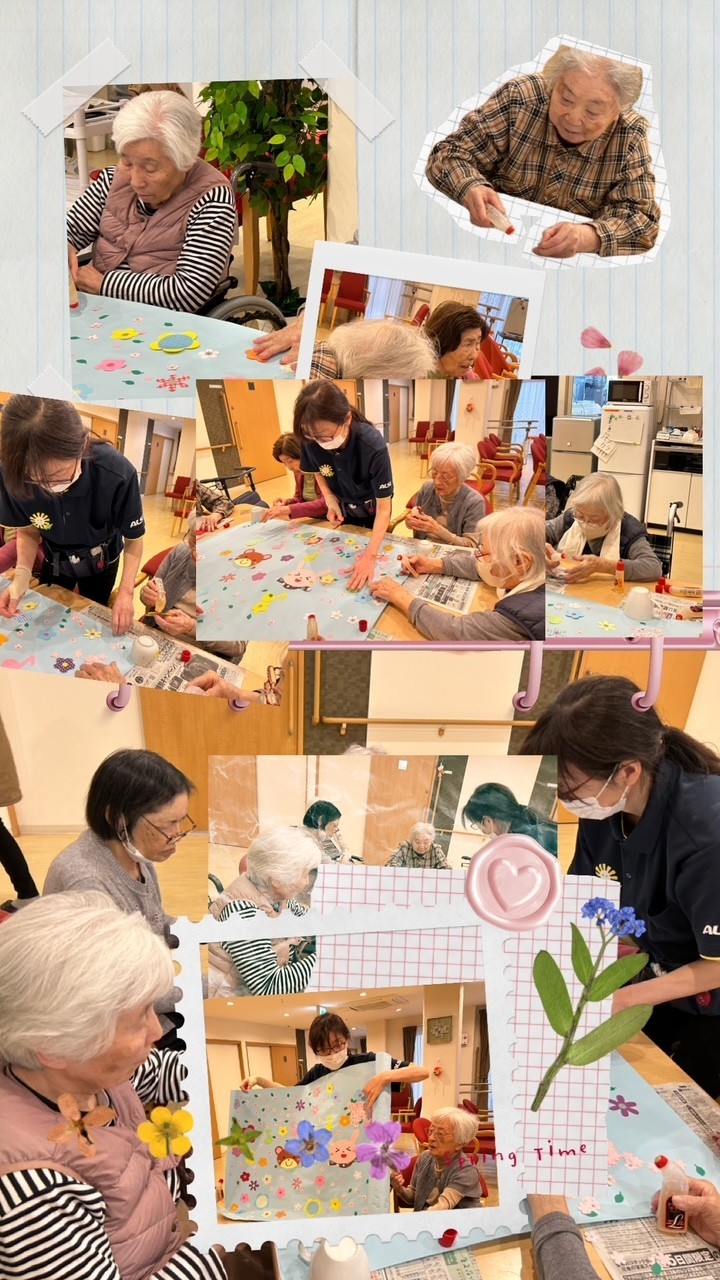 桜が待ち遠しいねと話しながら施設の中も桜でいっぱいにしましょうと楽しみながら素敵な壁絵アートを作成しました。