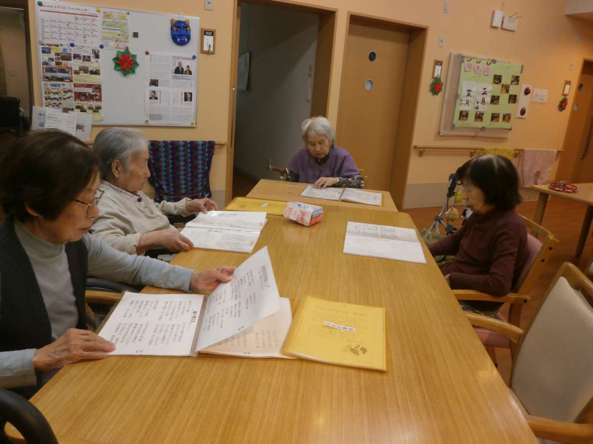 昼下がり、1階は塗り絵。2階は歌集を出して歌が始まりました!