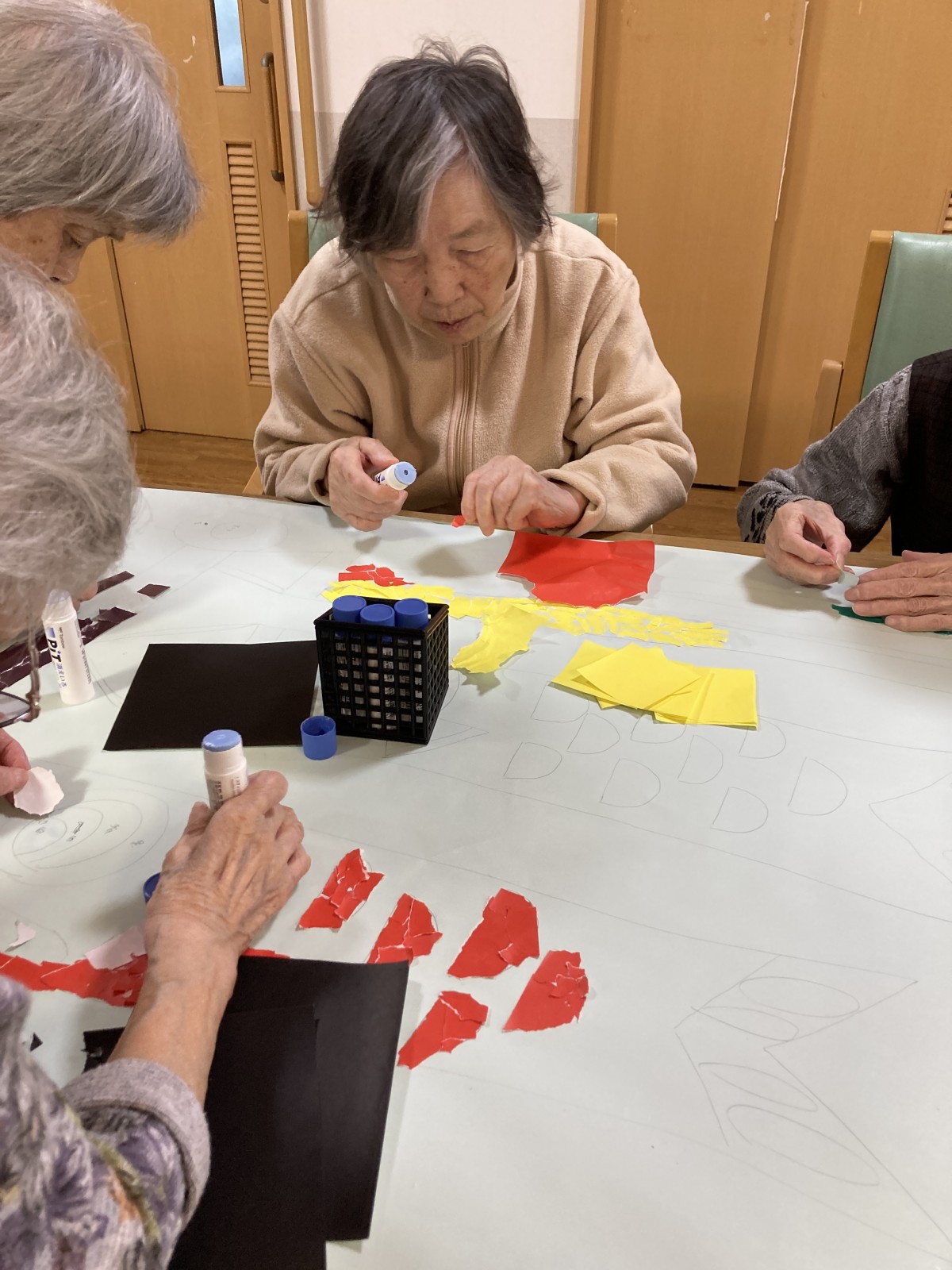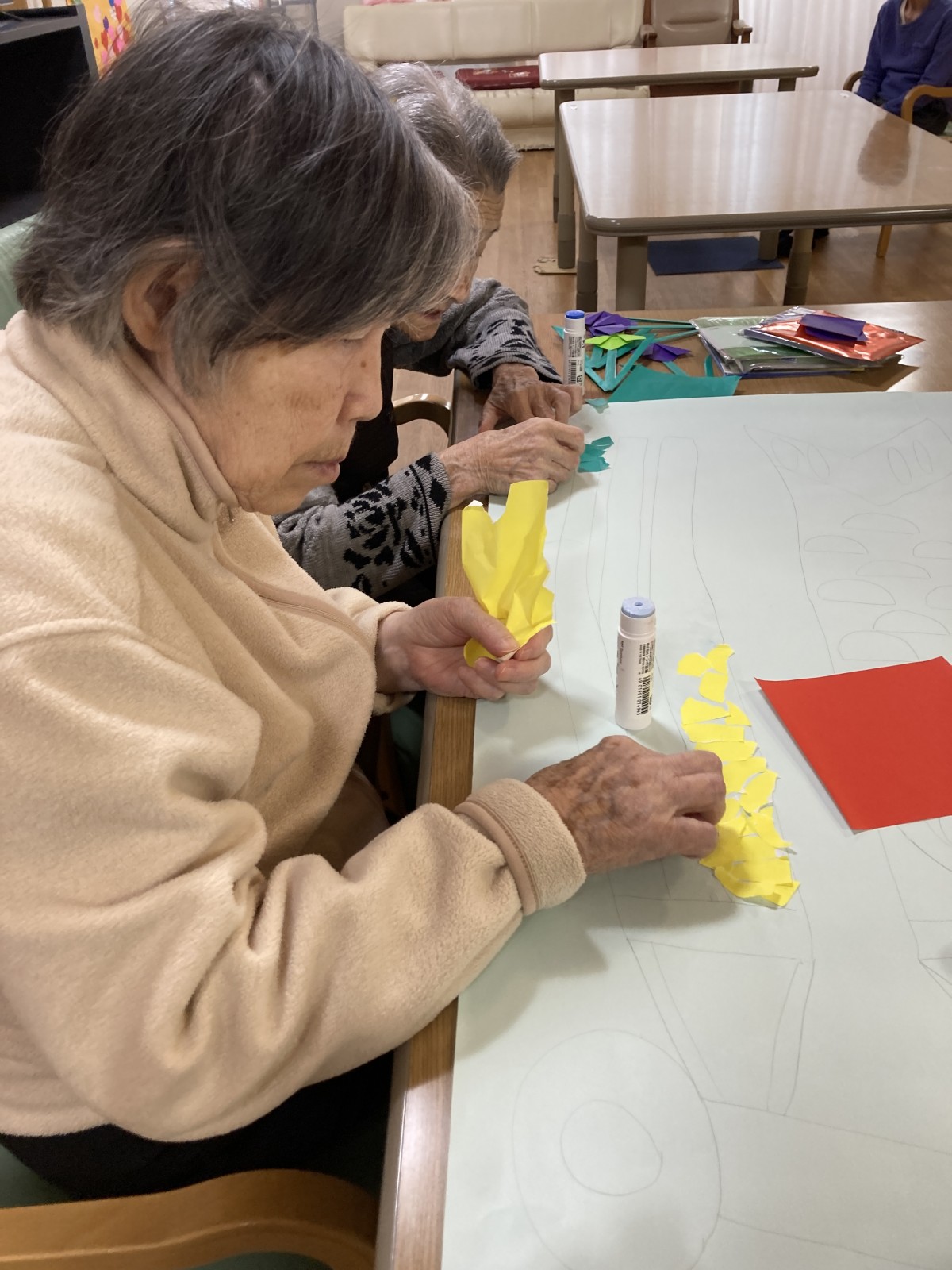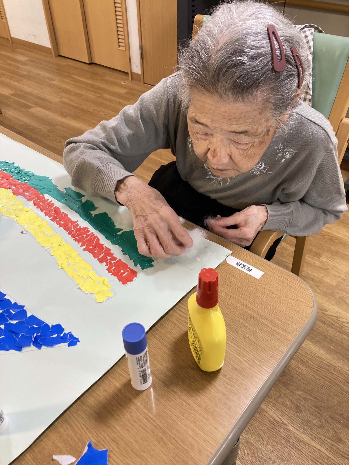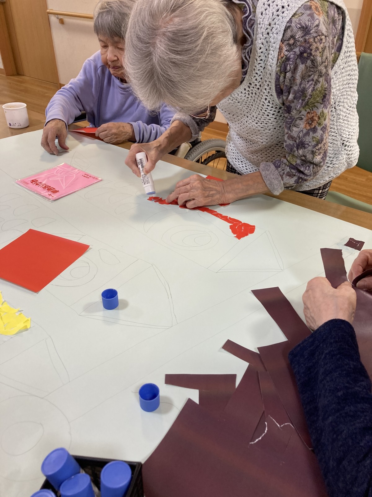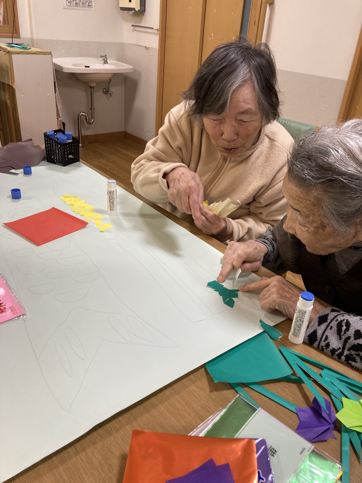 と相談しながら折り紙をちぎって貼っていっています。