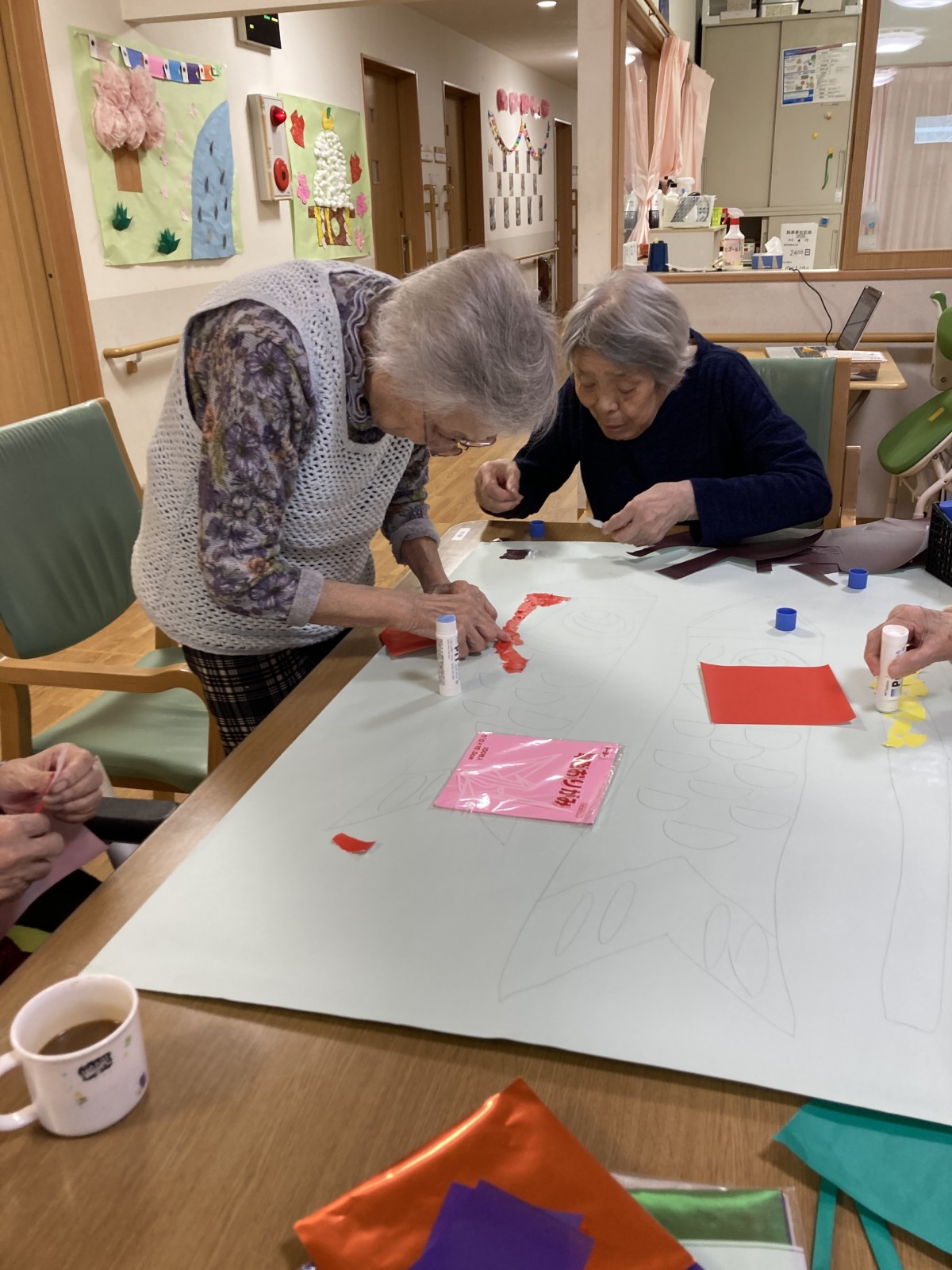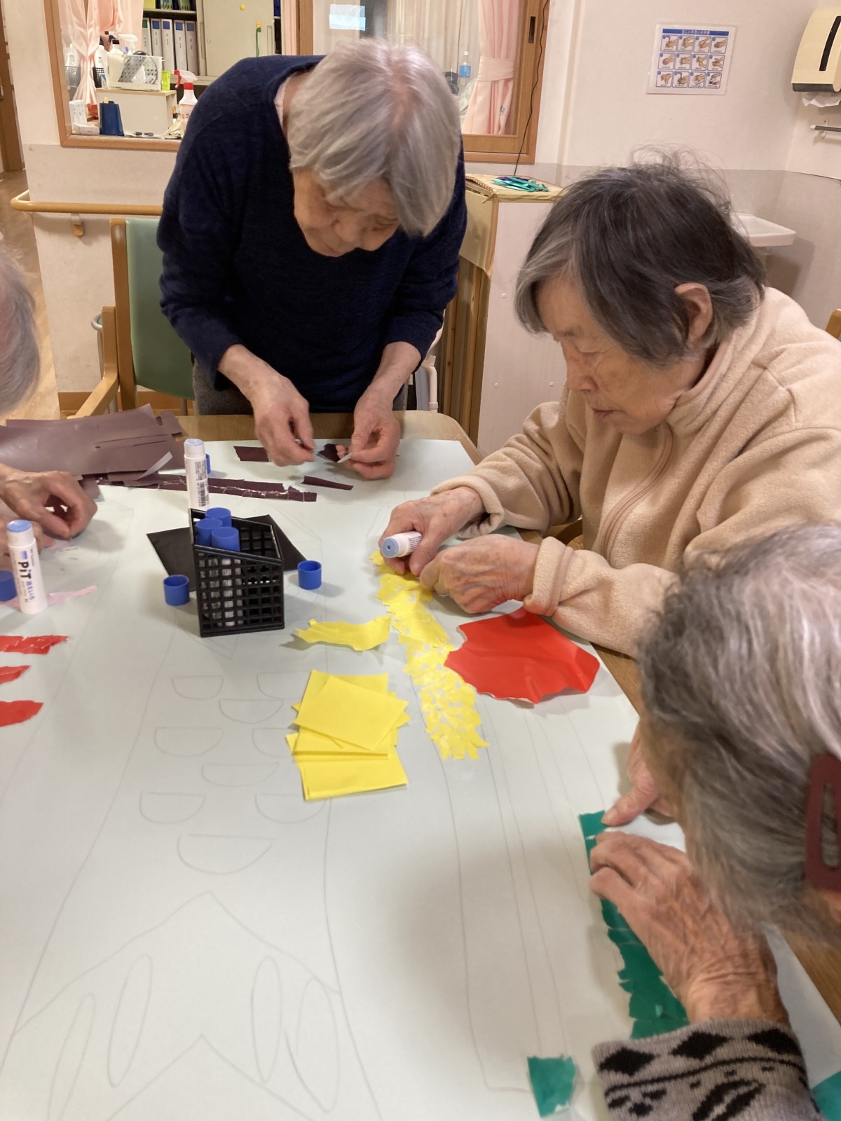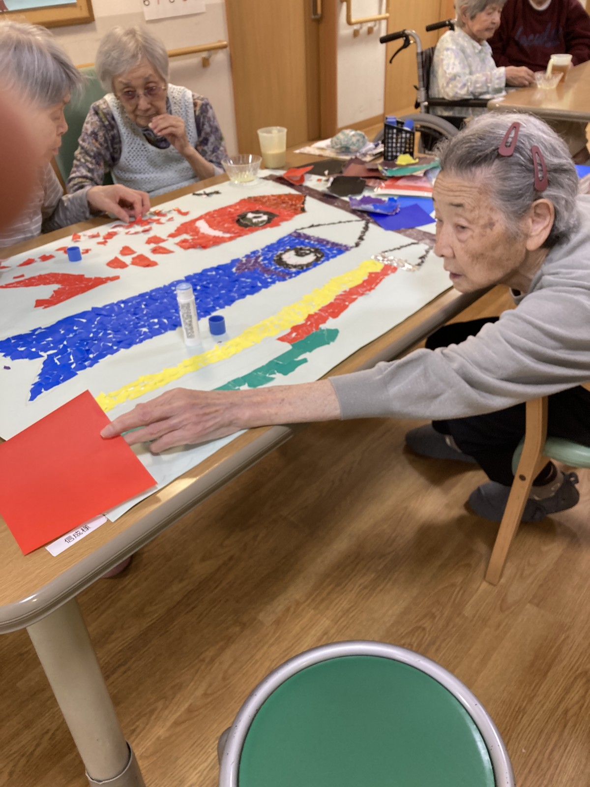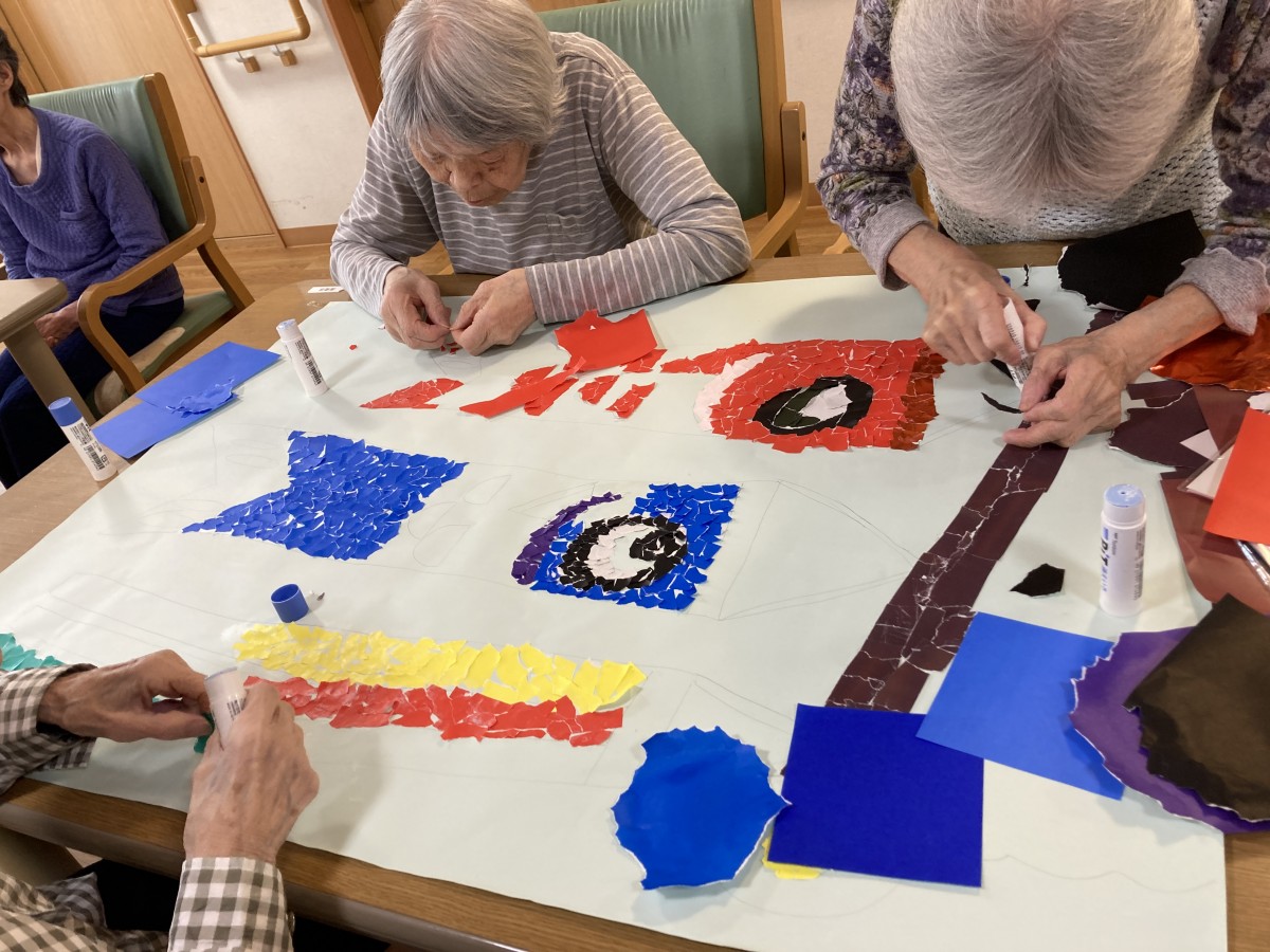 もうすぐこどもの日なので、今日は鯉のぼりのちぎり絵を行ないました。
