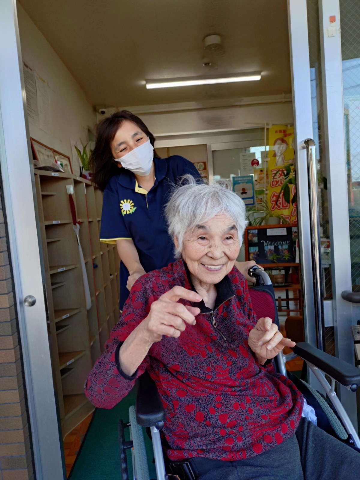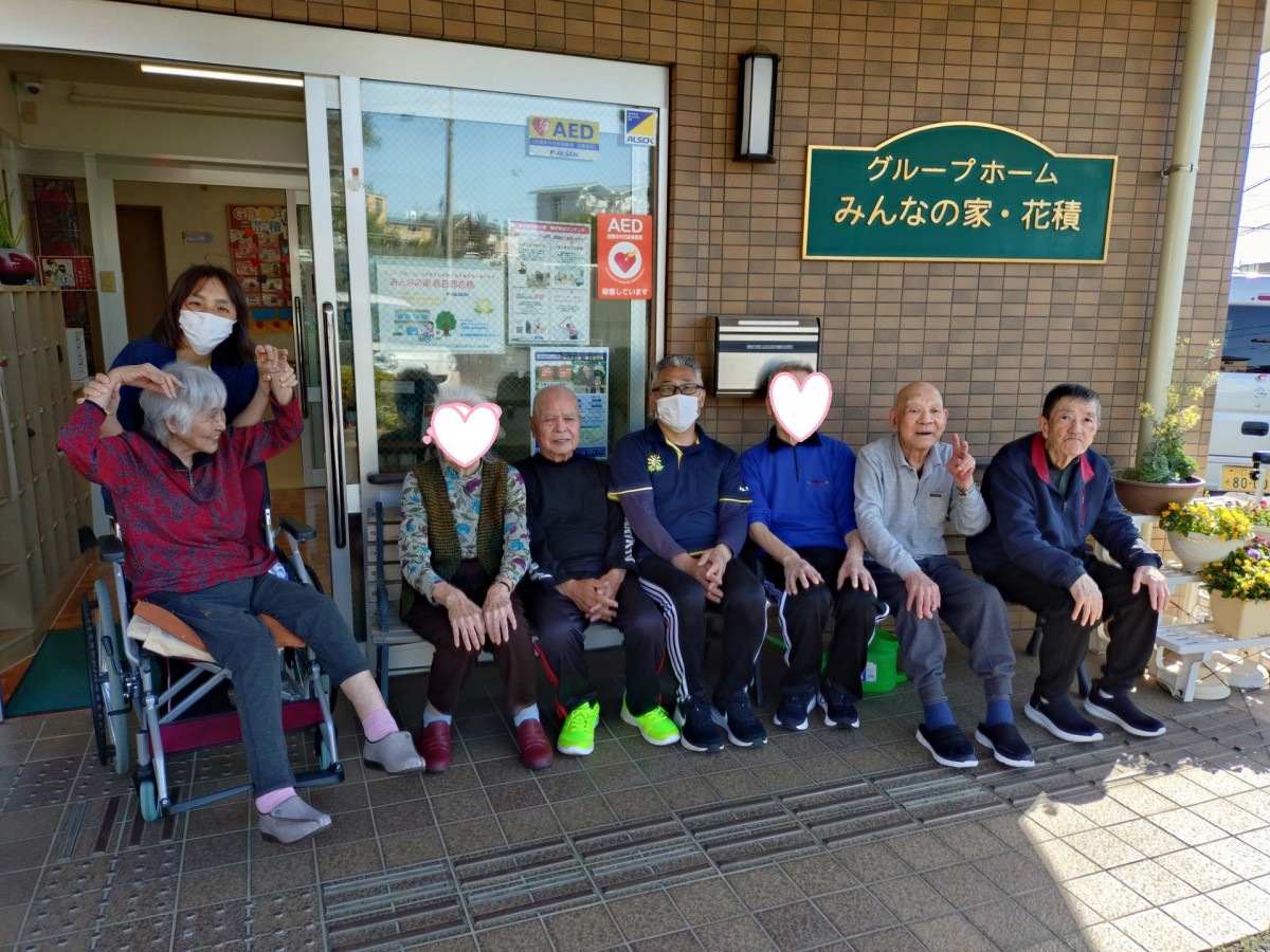ホームに帰り他のご利用者様に早速報告し皆さんと一緒に中庭でおしゃべりタイムが始まり