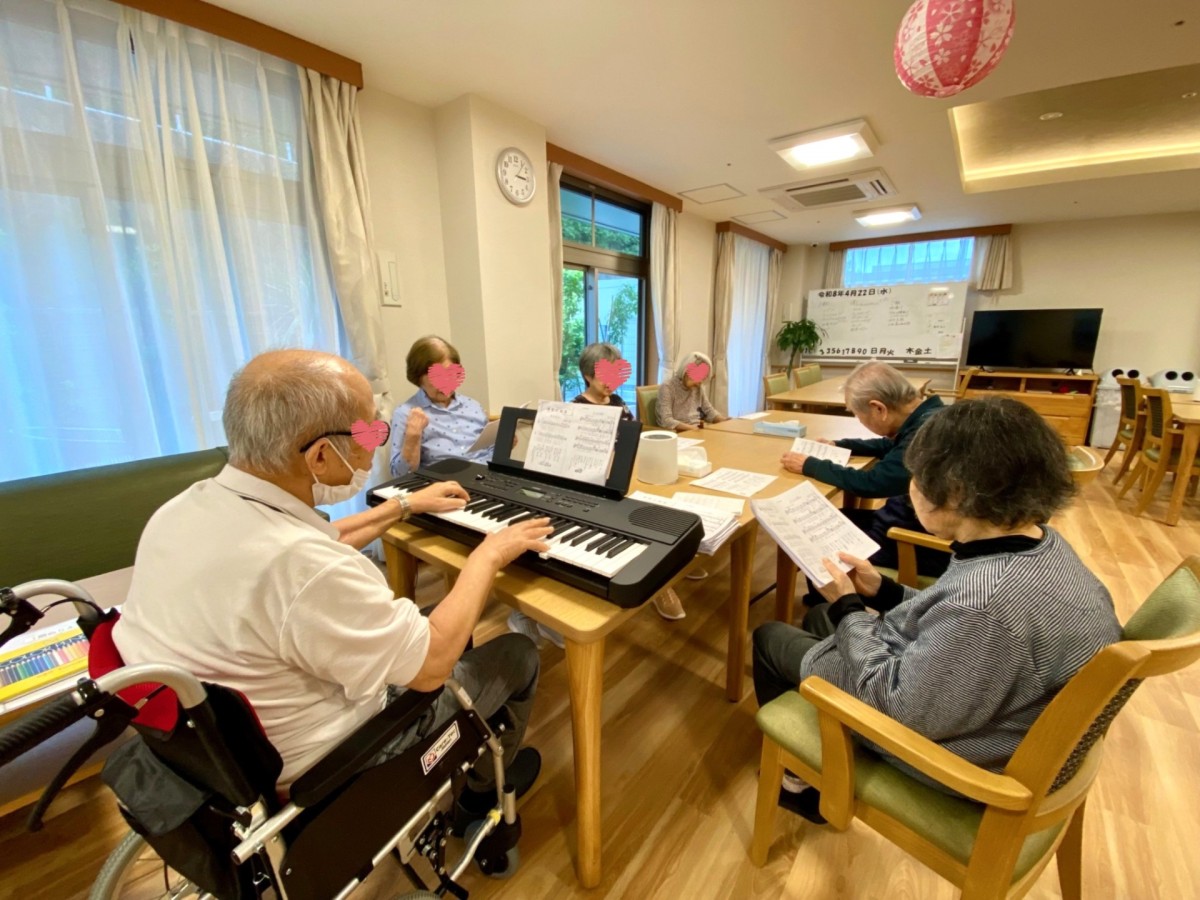 午後になると、コーラス&ピアノ経験のあるご入居者さまが中心となって行う「うたごえ喫茶」(※仮称です)が、