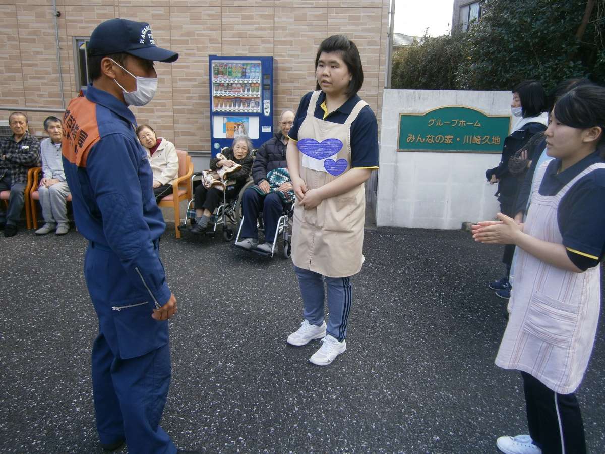 グループホームみんなの家・川崎久地では隣接しているグループホームみんなの家・川崎久地2と合同で夜間想定、避難訓練を行ないました。今回の訓練は消防署職員の方が立ち会い、地域の皆様にも多数参加して頂き、お力を貸して頂きました。