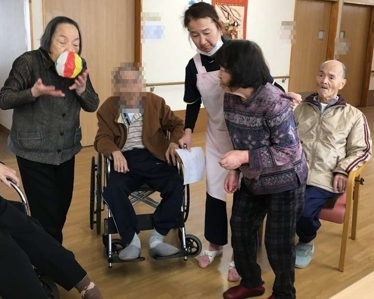 普段はグループホームの周辺を散歩するのですが、この日はあいにくの雨模様だったため、室内でレクリエーションをしました。