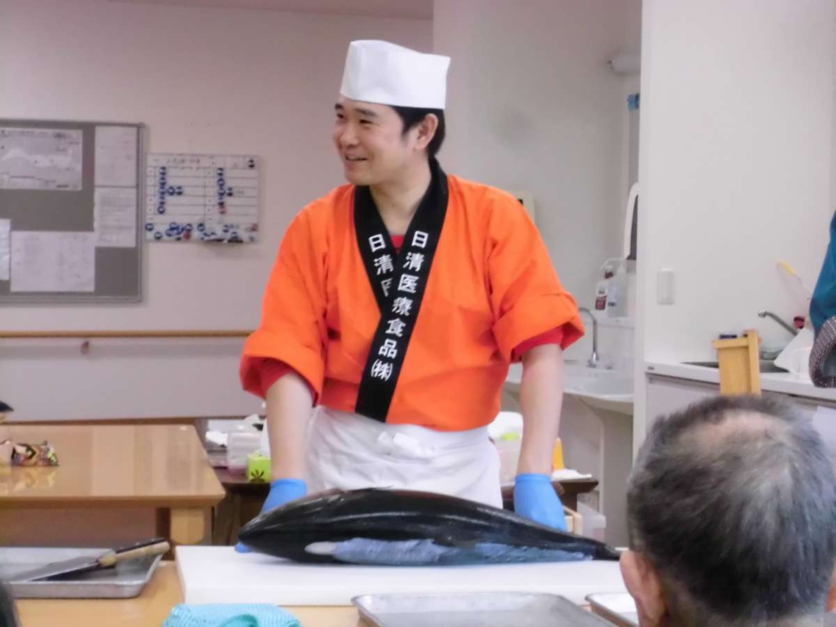 お昼にはお寿司の握りを披露しながら食べて頂きました。