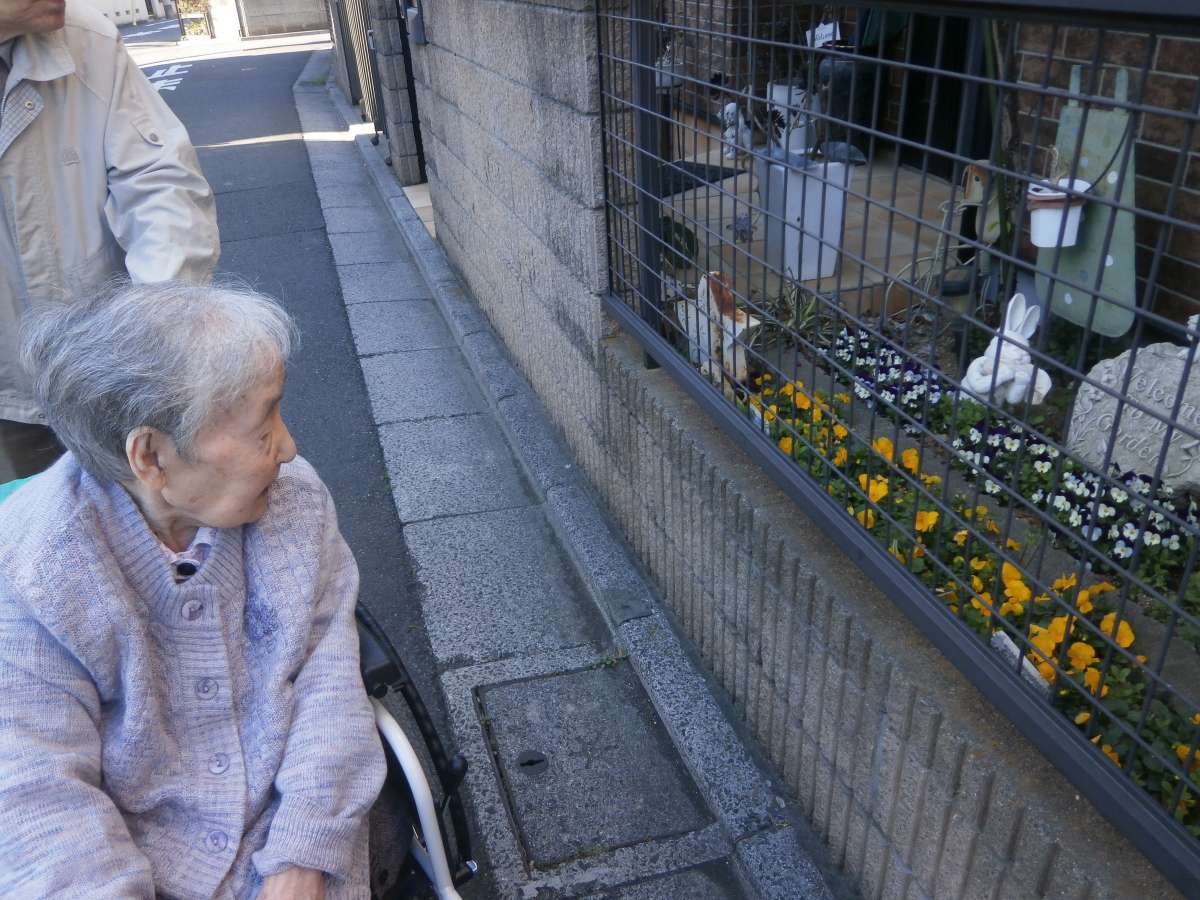 風はまだ冷たいね!でも、外に出て、花壇のお花を眺めたよ!