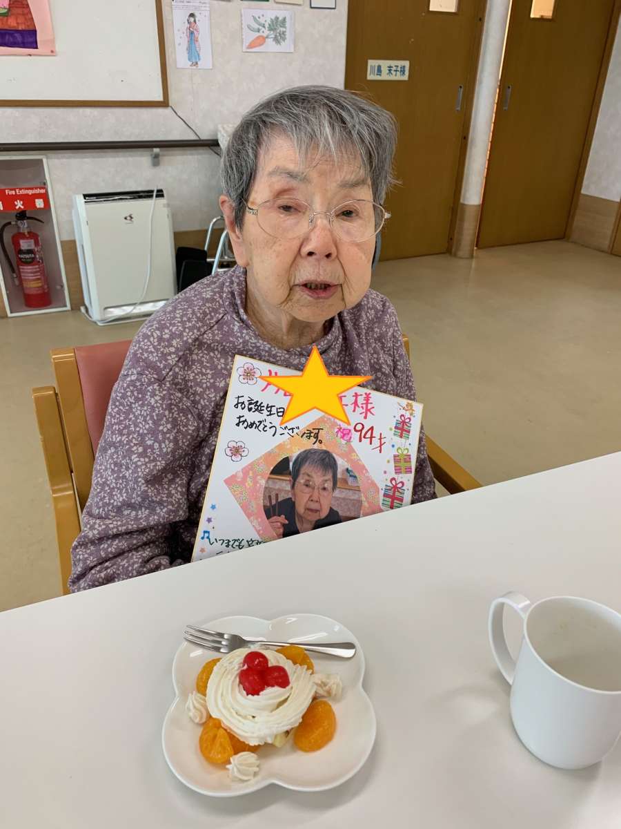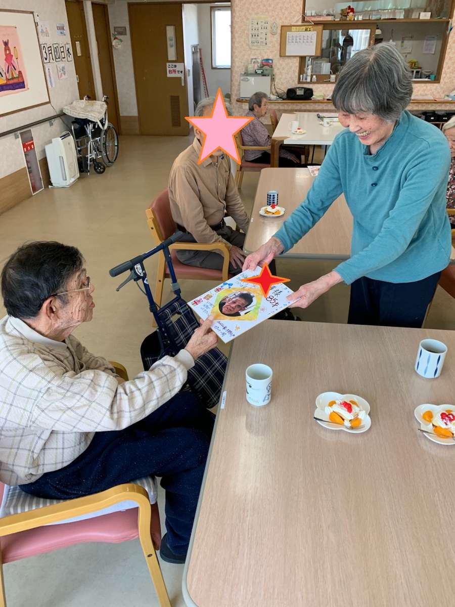 入居者様から、誕生日の入居者様へ色紙のプレゼントを渡して頂き、