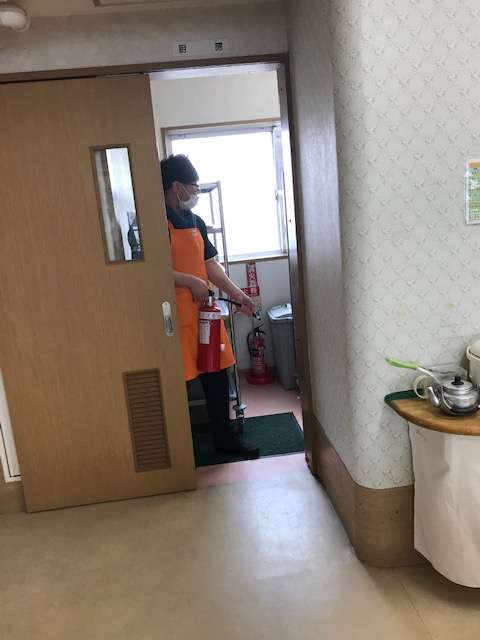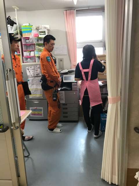 入居者様を避難誘導する係、と役割分担。避難に要する時間も計りました。