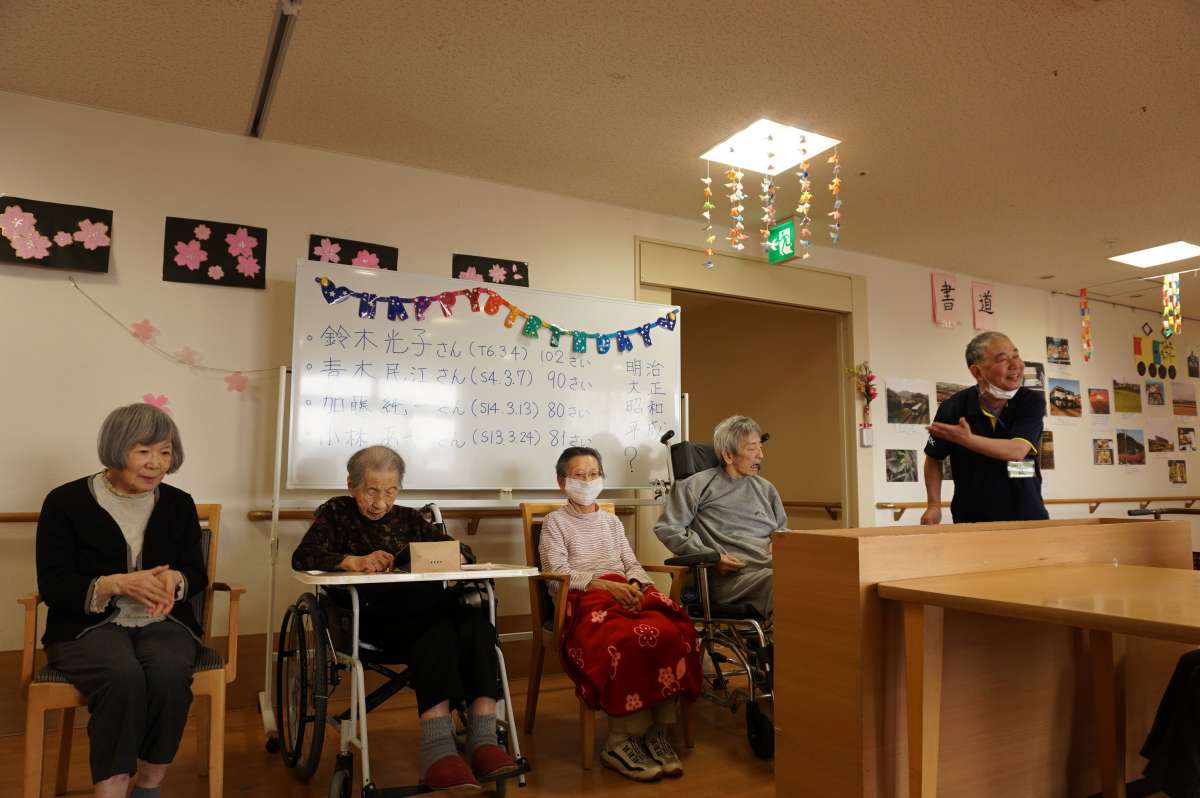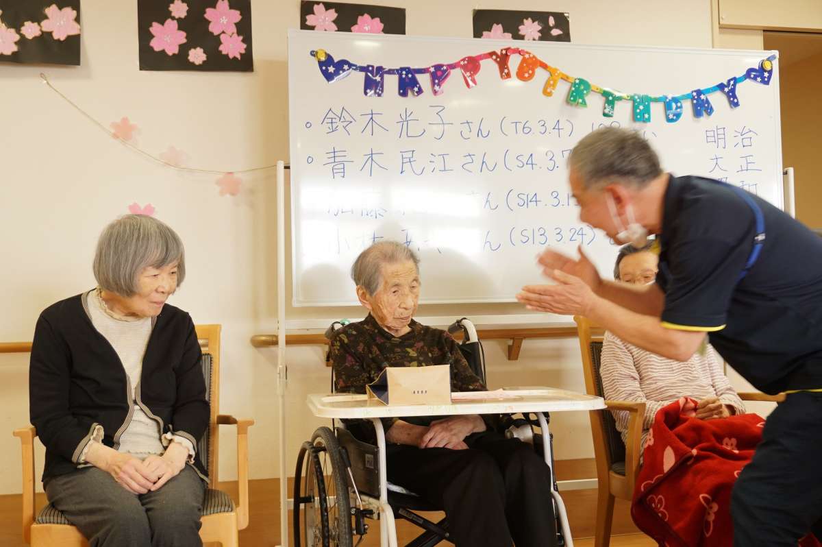 3Fフロアにおいて、3月のお誕生日会が開かれました。3月に誕生日を迎えられたご利用者様は、4名です。この中に、大正6年生まれの102歳のご利用者様がいらっしゃいます。すこや家・西東京一のご長寿様です。4月1日に新しい元号が制定されます。大正、昭和、平成そして新しい元号を逞しく、しなやかに生き抜く命の素晴らしさを感じます。
