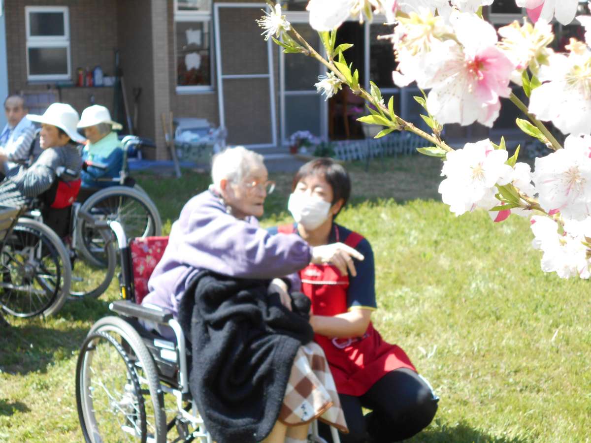 介護付有料老人ホームすこや家大宮日進の自慢の庭に咲く花や木々に魅了され、春の暖かい日差しの中、ご利用者様と日向ぼっこ。