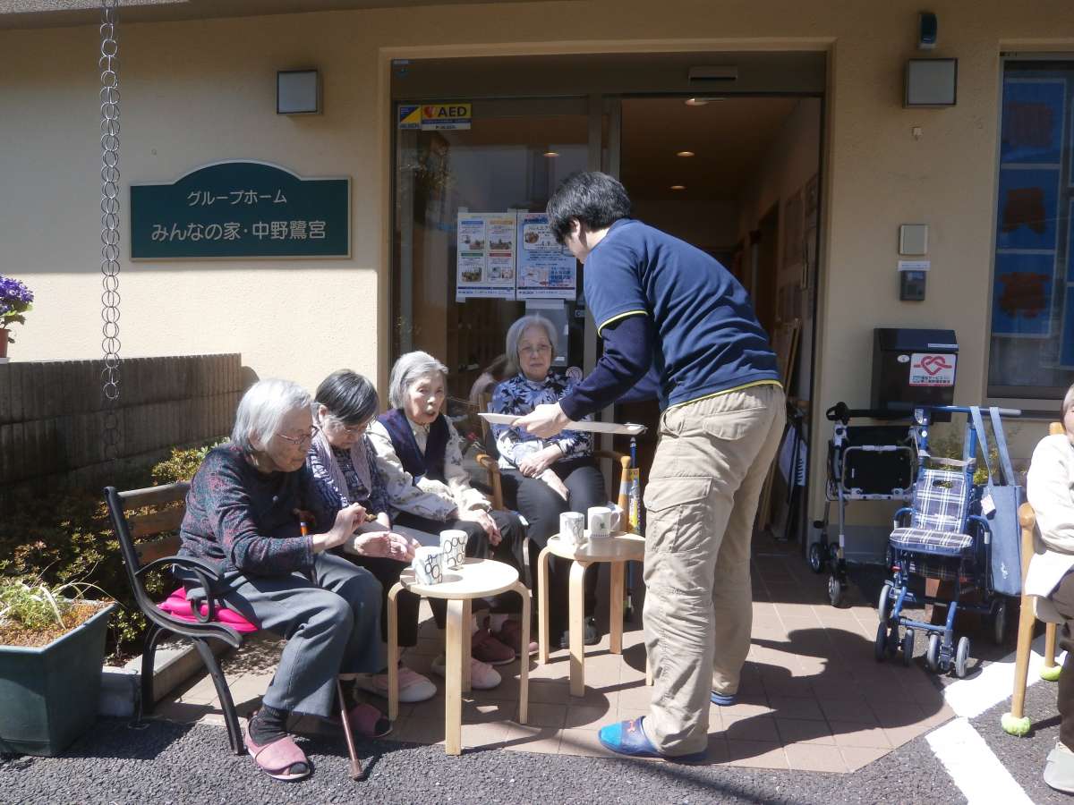 10時のお茶はお外でね!せっかくだから外で頂きましょう~!利用者様の声にスタッフ賛成~!!!