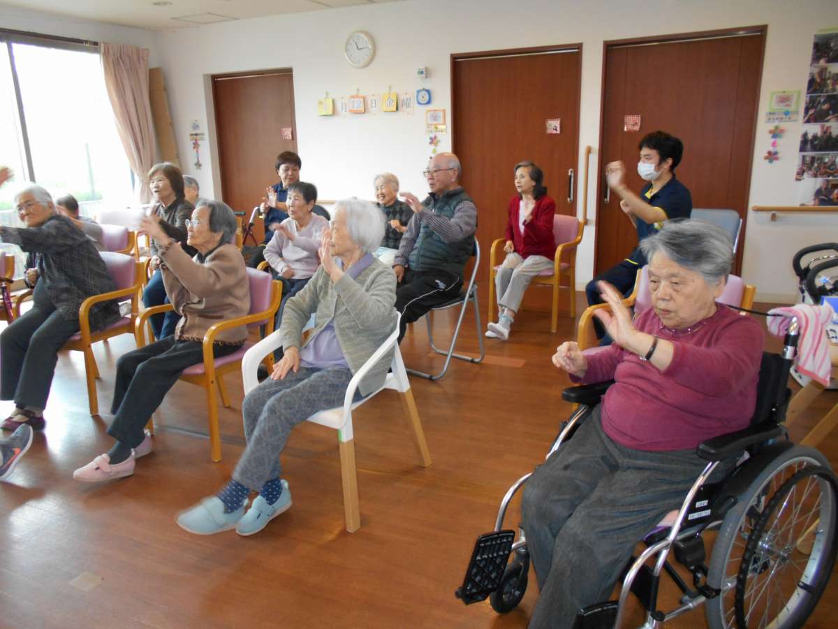 次に数を数えながら足踏みなどをした後、皆様の体調をみながら音楽に合わせて体を動かしました。