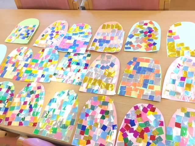 その画用紙に、キラキラな折り紙をみなさんとペタペタくっつけました!!