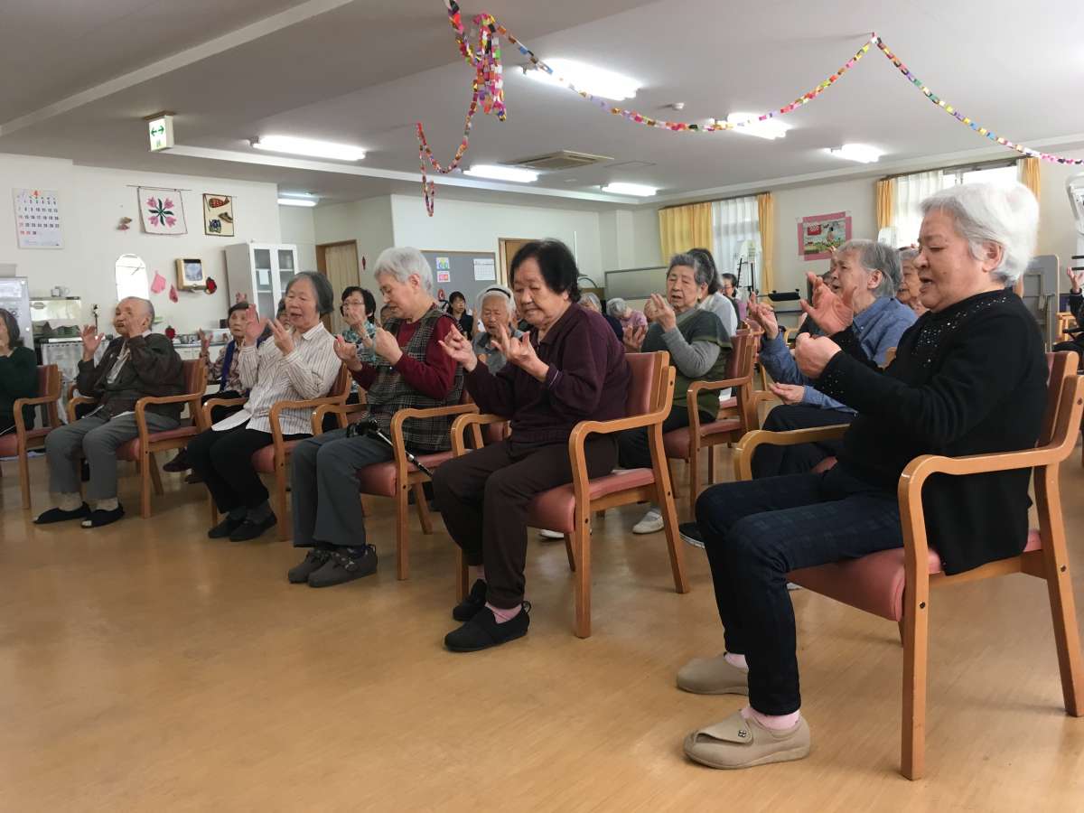 お腹いっぱいで眠くなる時間ですが、岡田先生登場でフロア内はご利用者様達の拍手と笑顔でいっぱいになりました(*^。^*)