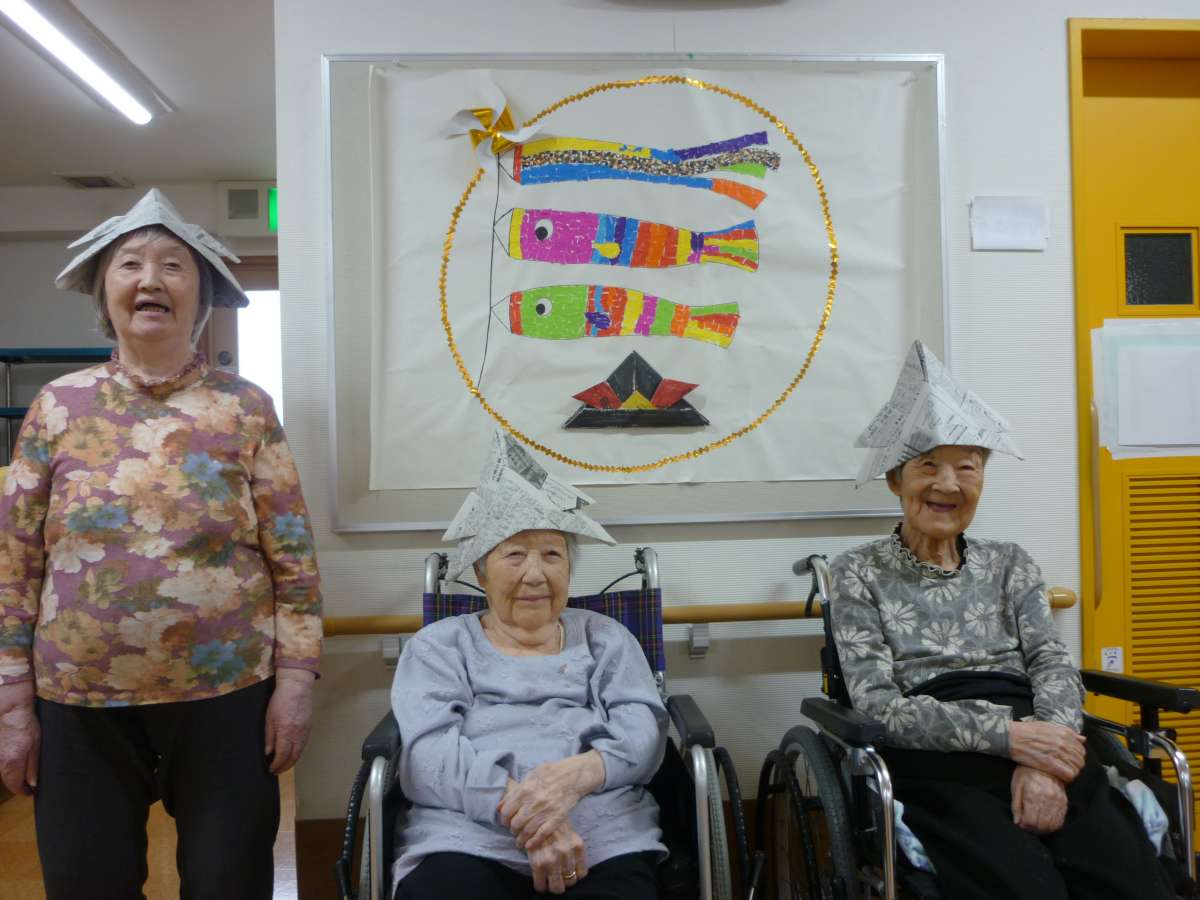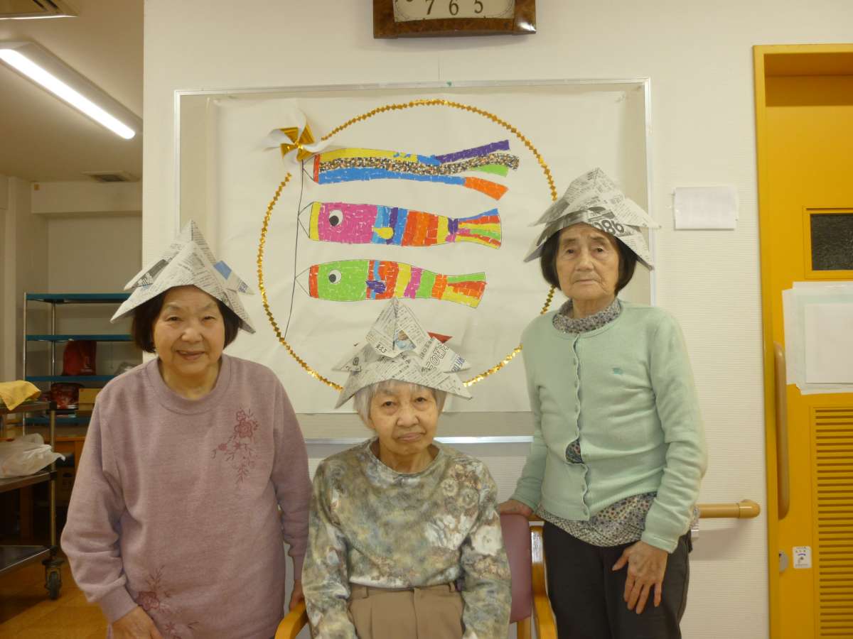 手作りの、鯉のぼりの前で、皆様で記念撮影!! 新聞紙で作った兜をかぶって頂き、ハイ!!ポーズ!!