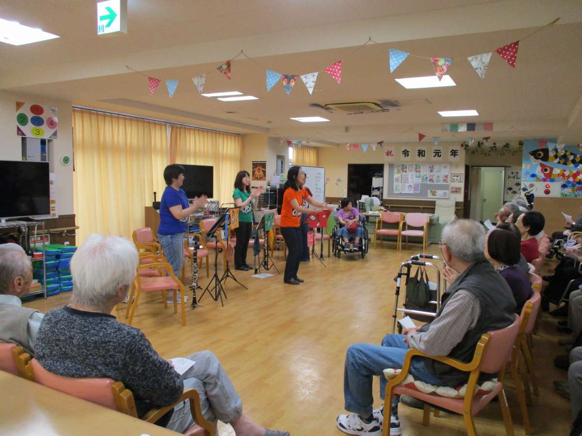 こんにちは。デイサービスセンター遊・川越南大塚です。5月9日はクラリネットママーズさんによる“クラリネット演奏会”を開催しました。奏でるハーモニーに魅了されてしまいましたね(*^_^*)手拍子で盛り上げたり、ベルを鳴らしたりとご利用者様も楽しく参加していただきました☆次回も必ず参加したいと言うご利用者様も(^^♪ 楽しみですね★追加利用・振替利用も受け付けていますので、お気軽にお問い合わせください♪