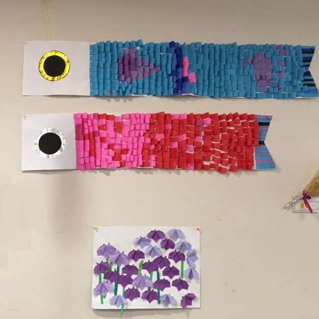 鯉のぼりは紙を丸くして貼ってあります。