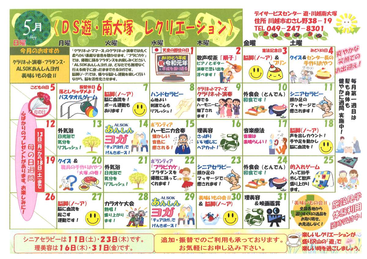 こんにちは。デイサービスセンター遊・川越南大塚です。5月11日は大好評の“シニアセラピー”を行いました(^^♪お楽しみの1つは職員(美人揃い♪)との楽しいお話ですね・・・ゆっくりマッサージをしながら心も癒されていただきます❦気持ち良すぎてウトウトしてしまうご利用者様も多いです(-_-)zzz体験利用も出来ますので、是非一度デイサービスセンター遊・川越南大塚自慢の“シニアセラピー”をお試しください☺他にも楽しいレクリエーションを毎日やっています(*^_^*)