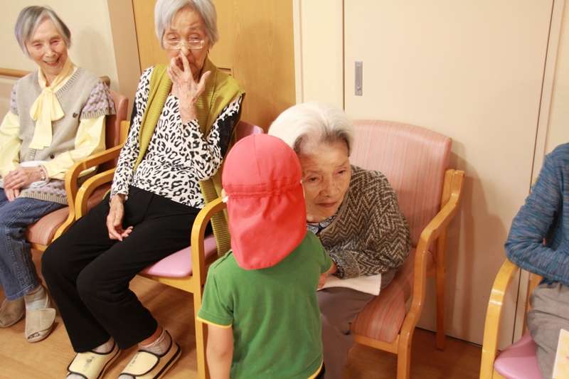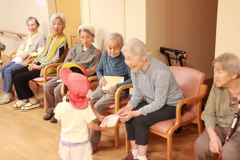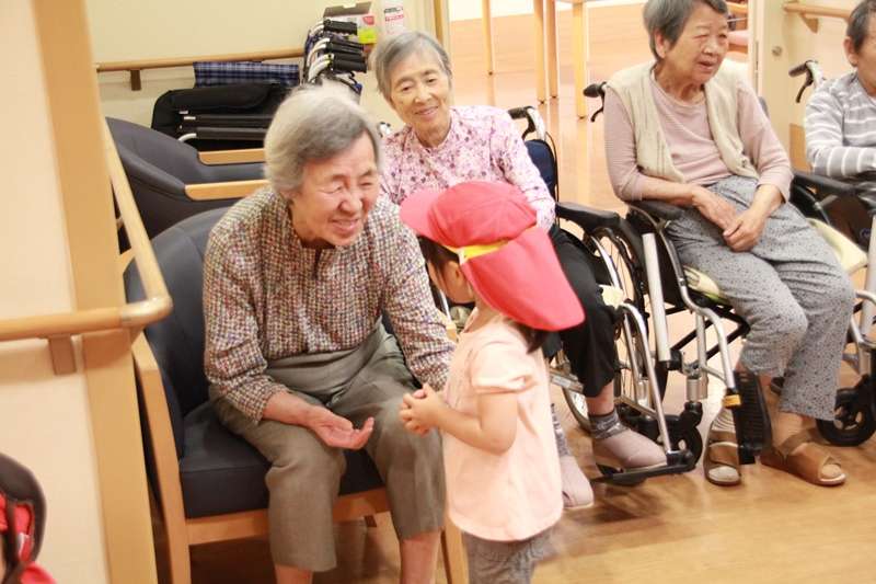 5月30日(水)ご近所の、きたしば保育園の年少組のエンジェル15名の皆様と引率の先生が、5月にお誕生日を迎えられたお二人のご利用者様に、バースデイカードとお歌のプレゼントに訪問してくれました。3歳児とはいえ皆様しっかりとご挨拶ができとても賢いエンジェルちゃんでした。時間にして、20分ほどの行事でしたが、ご利用者様達の笑顔がとてもすてきでした。 いつも、サヨナラをする前に、ご利用者様達と、握手電車をします、皆様この時の笑顔はいつも優しいお爺ちゃんとお婆ちゃんの顔です。いつも、ありがとうございます。今度は7月にお会いしましょう。