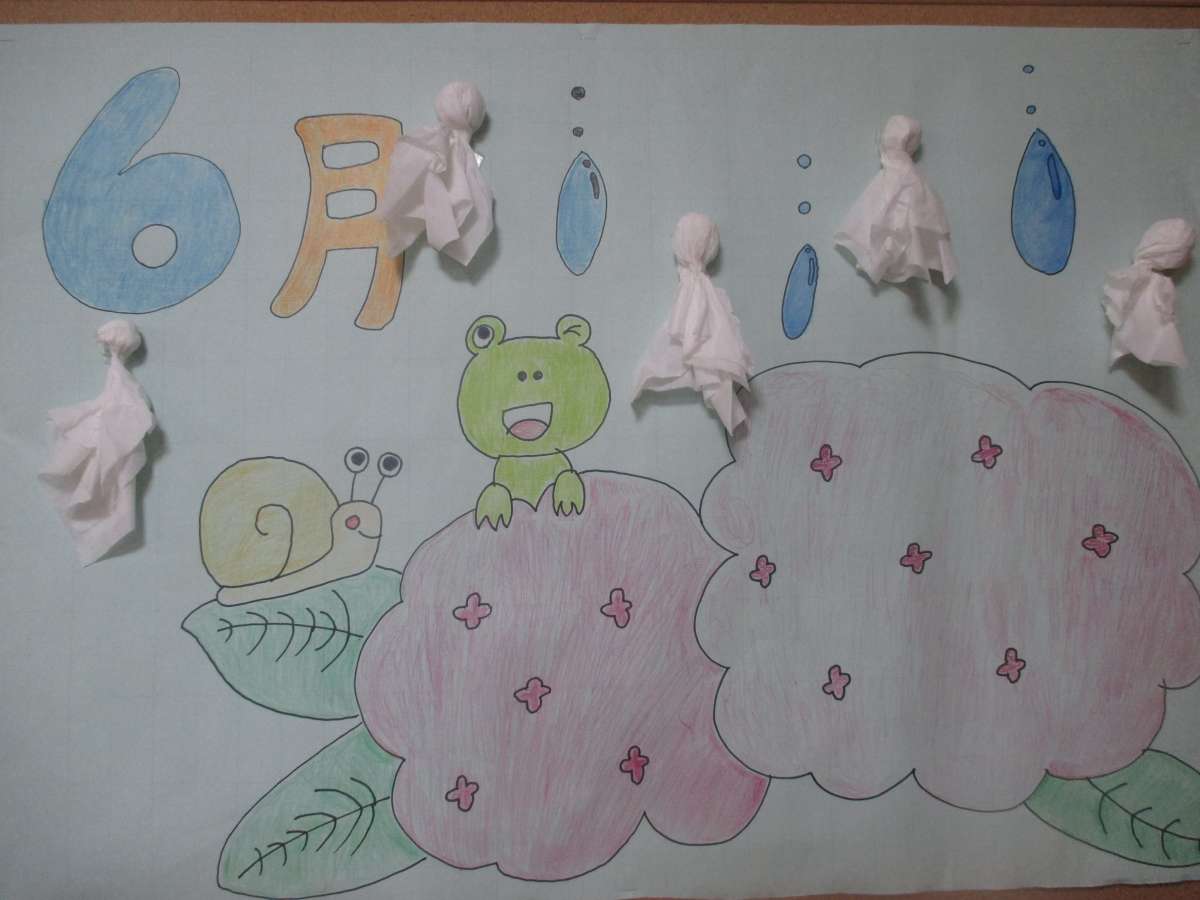職員が描いたカエルや雨粒、紫陽花の下絵に色塗りをして頂き、
