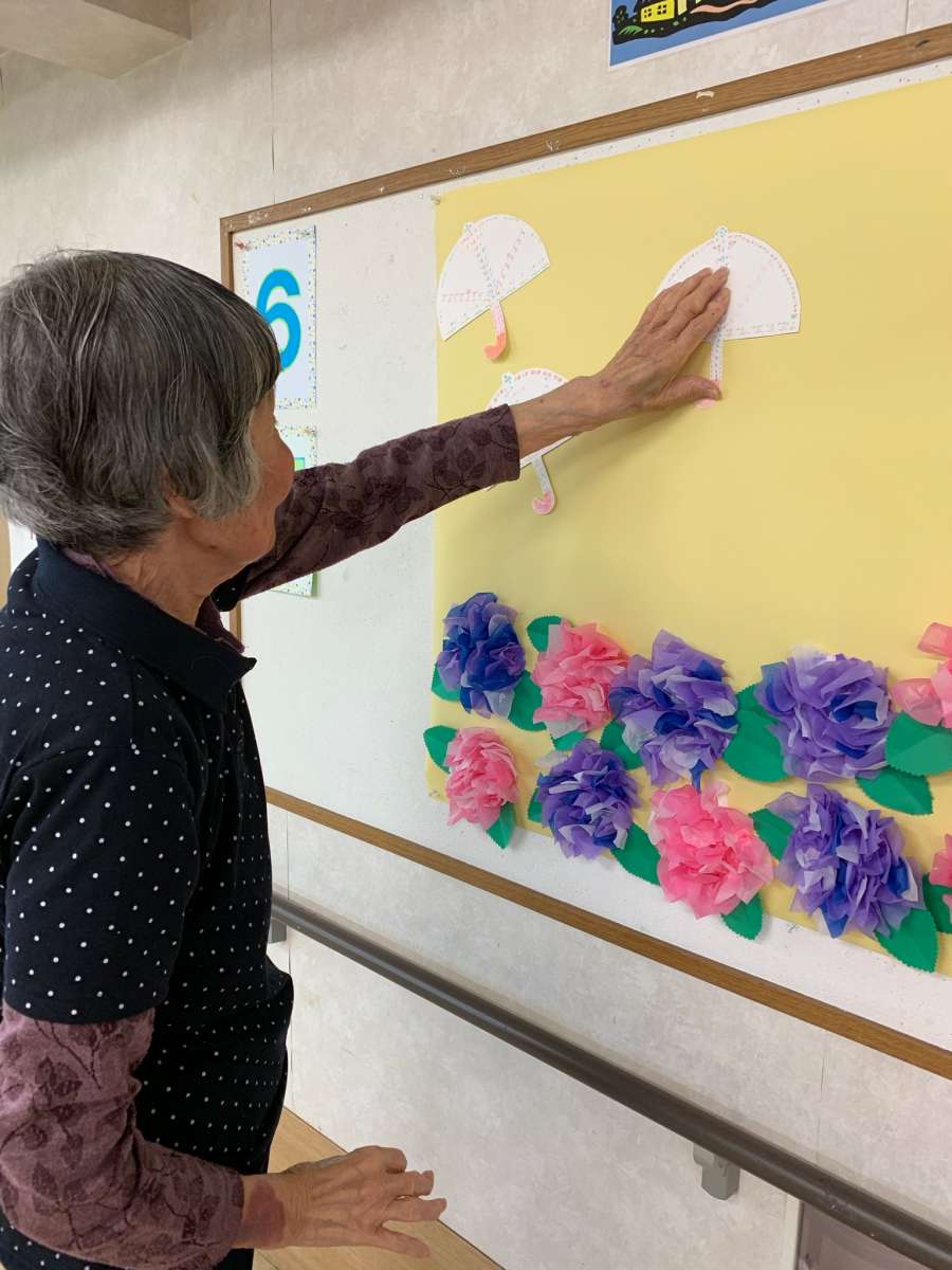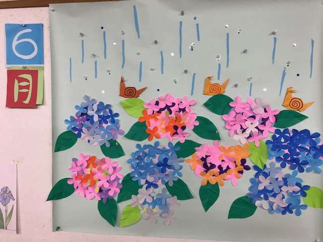 今月の壁画は、皆様と一緒に作った紫陽花や☂ですヽ(^o^)丿