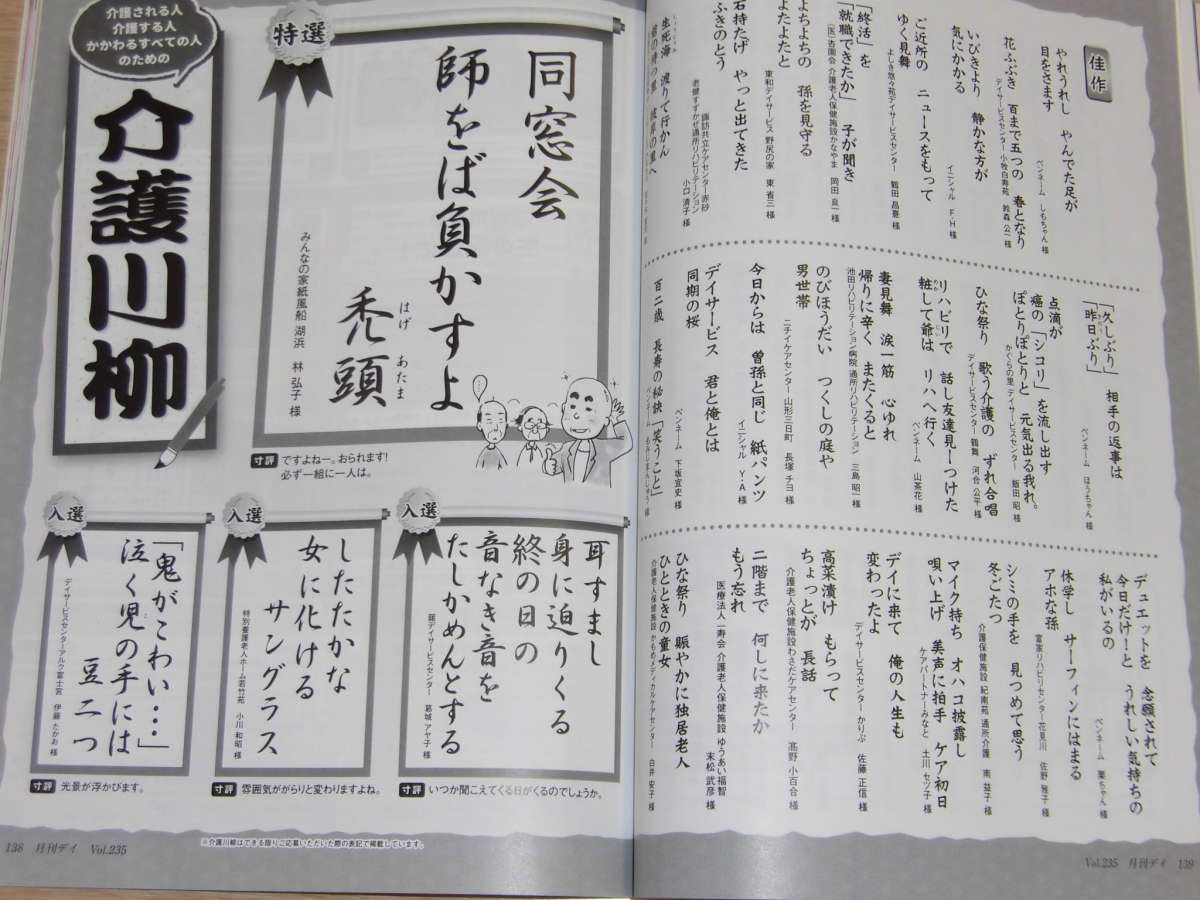 介護に携わっている方ならご存知かと思いますが、月間DAYと言う雑誌の中に記載されている【介護川柳】と言う内容があり、こちらに関してはどなたでも応募ができる川柳となっているのですが、