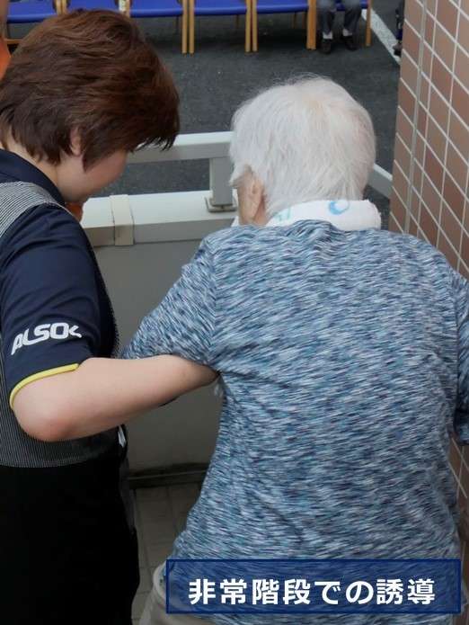 (尚、車椅子使用のご利用者様は、エレベーター使用し1階へ誘導しています)