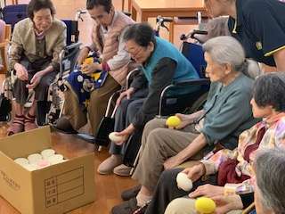 本日は楕円形のゴムボールを使ったレクレーションってやつです