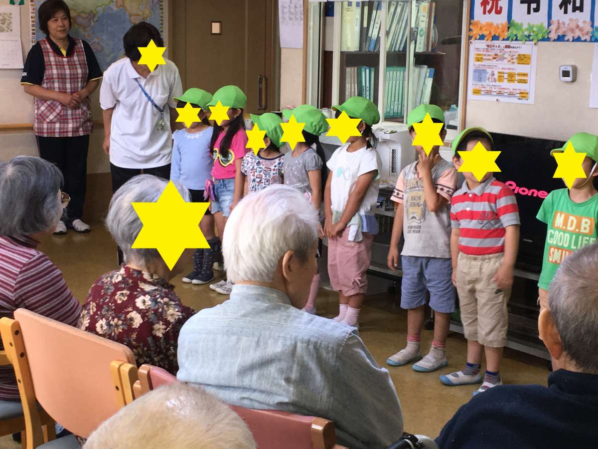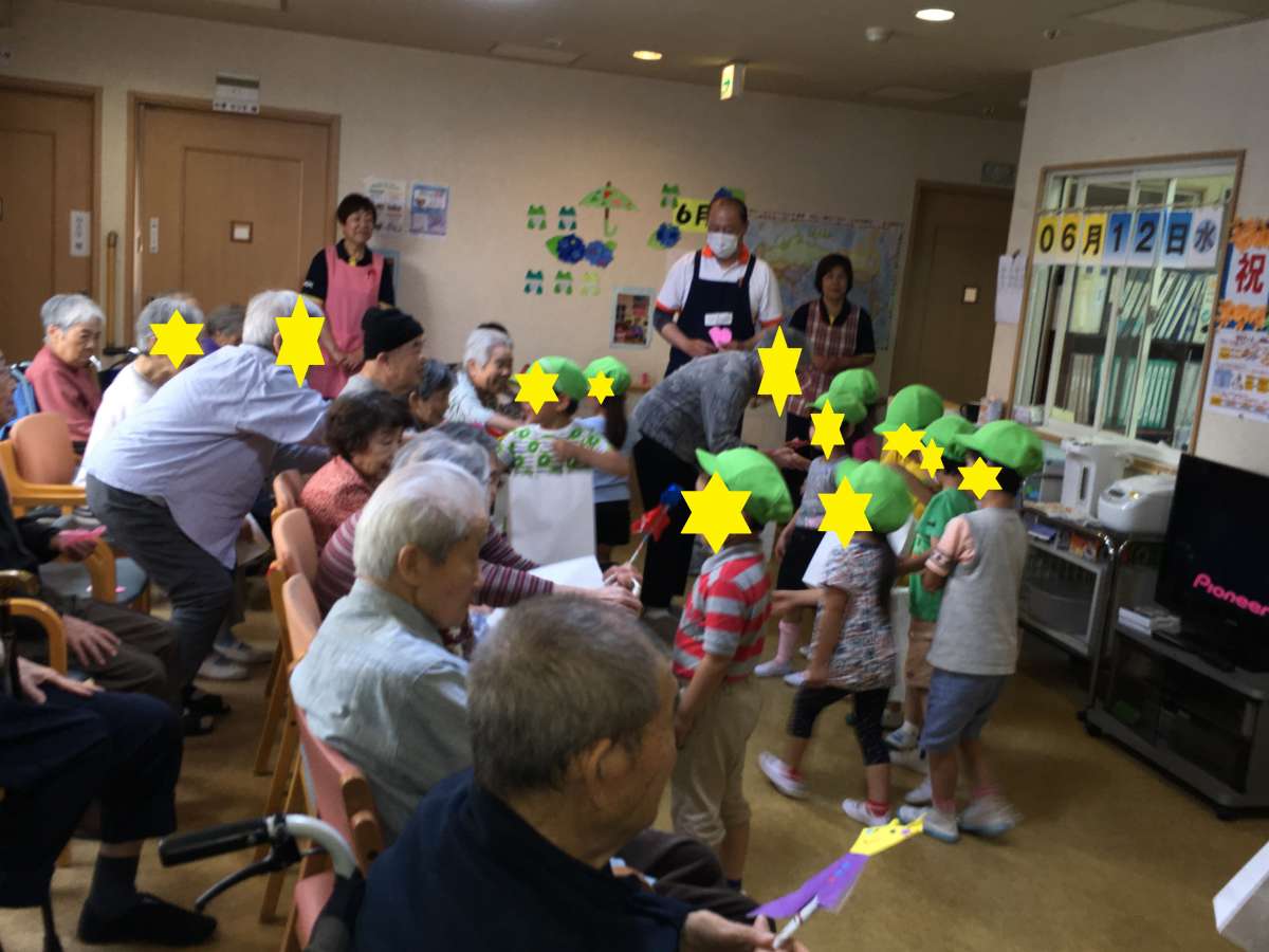 保木間保育園の園児の皆様が訪問され、森のくまさんの歌や手作りの折り紙の工作などの