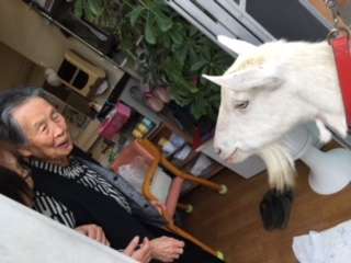 グループホームみんなの家・横浜三保2裏側高台にあるお寺(忠暘院)で飼っているヤギのメーちゃんとミーちゃんご紹介は以前にしましたが、なんとメーちゃんとミーちゃんがホームに遊びに来てくれました。