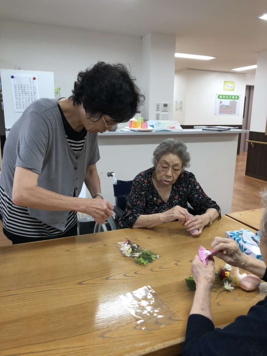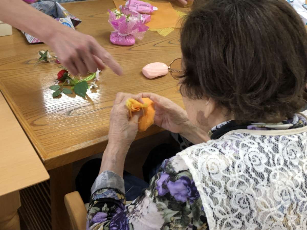 袋に、石鹸をいれて、お花で綺麗に飾る。