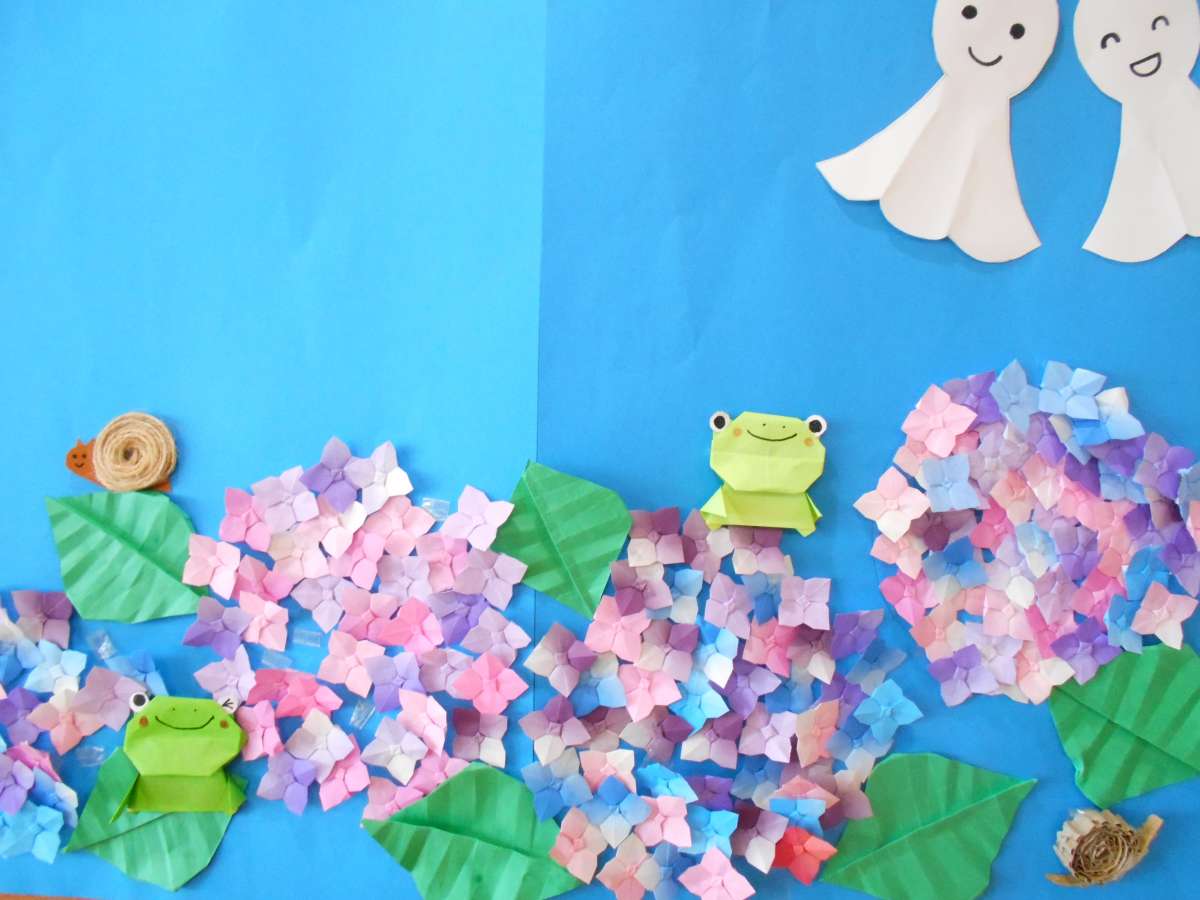 あじさいなどの貼り絵も順調に数が増し、その一方で七夕の準備にも余念がありません。