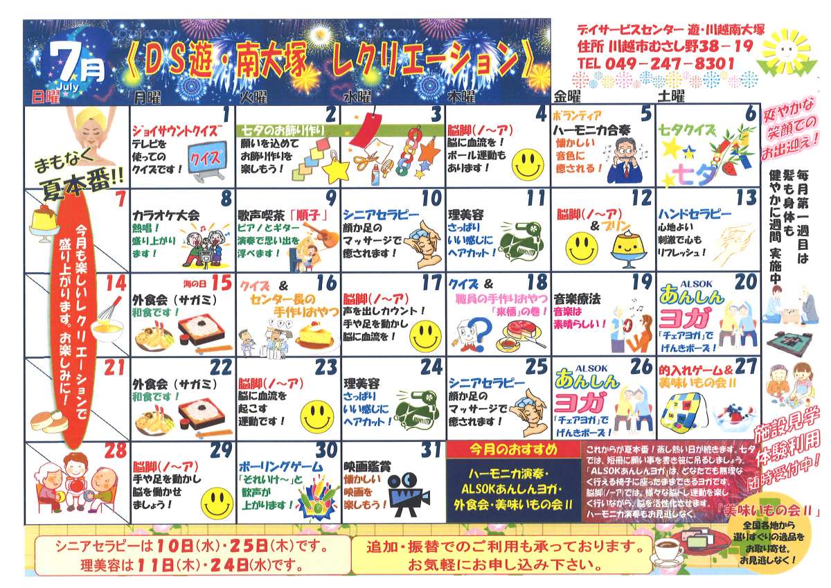 デイサービスセンター遊・川越南大塚 7月のレクリエーションカレンダーです。今月も当社オリジナルのNOAエクササイズを始め、ALSOKあんしんヨガ、シニアセラピー、外食会など楽しいプログラムが満載です。是非見学・体験利用にお越しください。