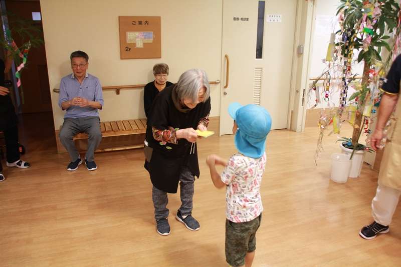 今日は、グループホームみんなの家 西東京です。昨日は七夕様でしたが、東京は雨模様で残念ながら、居り姫様彦星様は、観ることはできませんでした。ご利用者様は、早くからお願い事を、短冊に書いて吊るしてありましたがどのくらい願いがかなったでしょうか?願い事の第1位は、やはりおいしいものを食べたい。お寿司が食べたいと言う願いが多かったので、7日の日に昼食のメニューはソーメンだったので、ソーメンをお吸い物にして、五目ちらし寿司にして皆様に召し上がっていただきました。また、7月4日に、ご近所のきたしば保育園の園児さんと先生が、七夕飾りを持って訪問してくれました。この日も雨模様で、2人の園児さんでしたが、お爺ちゃんやお婆ちゃんは大喜び、七夕様の歌を皆様と一緒に歌い、帰りがけに皆様と握手電車でご利用者様おひとりずつ握手をし、バイバイしました。