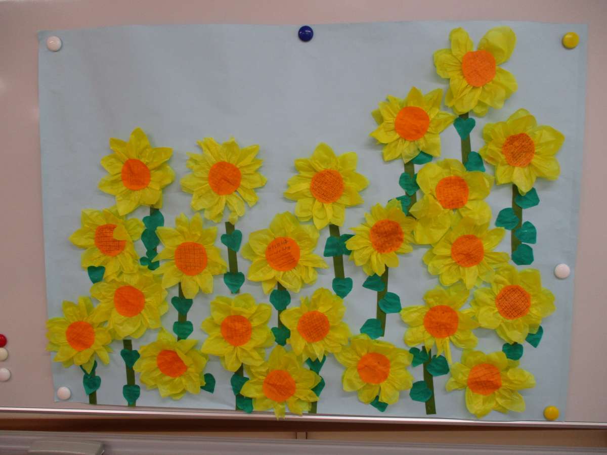 作成されたひまわりは、皆さんがそれぞれ模造紙に貼り付けました。