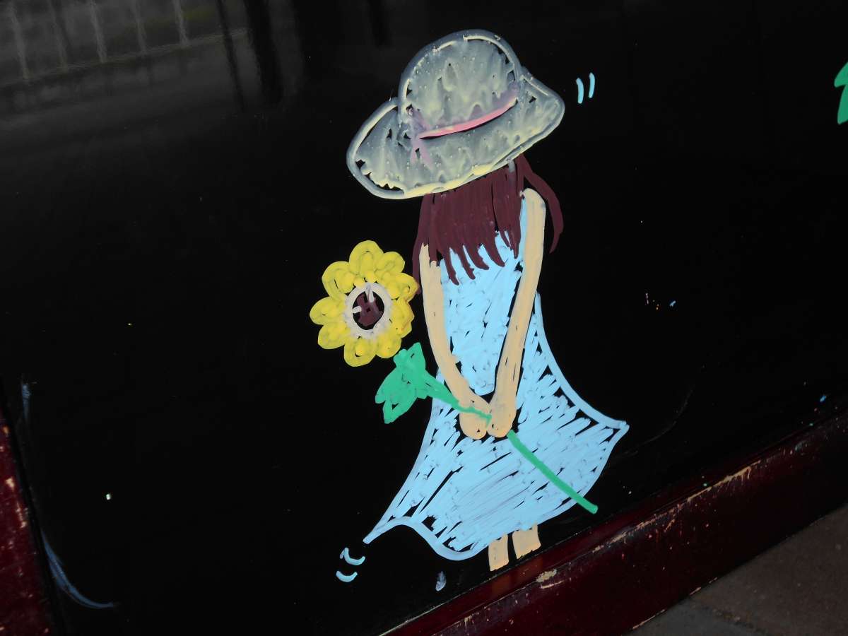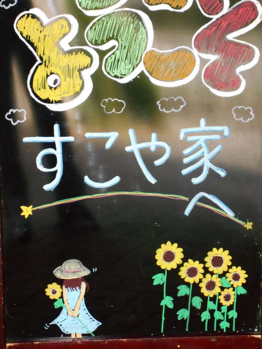 玄関前に設置されているウェルカムボードに、夏をイメージした少女とひまわり。